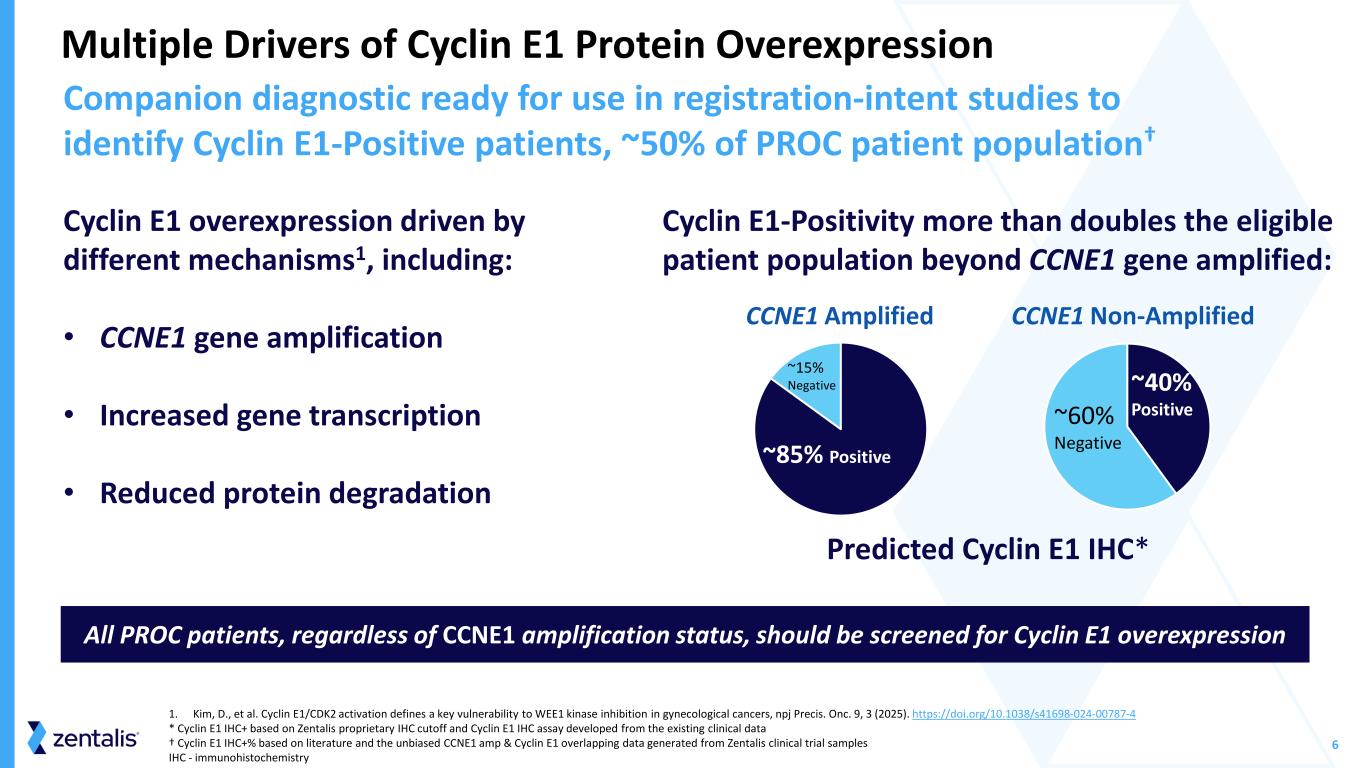 6 Multiple Drivers of Cyclin E1 Protein Overexpression Companion diagnostic ready for use in registration-intent studies to identify Cyclin E1-Positive patients, ~50% of PROC patient population† 1. Kim, D., et al. Cyclin E1/CDK2 activation defines a key vulnerability to WEE1 kinase inhibition in gynecological cancers, npj Precis. Onc. 9, 3 (2025). https://doi.org/10.1038/s41698-024-00787-4 * Cyclin E1 IHC+ based on Zentalis proprietary IHC cutoff and Cyclin E1 IHC assay developed from the existing clinical data † Cyclin E1 IHC+% based on literature and the unbiased CCNE1 amp & Cyclin E1 overlapping data generated from Zentalis clinical trial samples IHC - immunohistochemistry All PROC patients, regardless of CCNE1 amplification status, should be screened for Cyclin E1 overexpression Cyclin E1 overexpression driven by different mechanisms1, including: • CCNE1 gene amplification • Increased gene transcription • Reduced protein degradation Cyclin E1-Positivity more than doubles the eligible patient population beyond CCNE1 gene amplified: ~15% Negative ~85% Positive CCNE1 Non-Amplified Predicted Cyclin E1 IHC * CCNE1 Amplified ~40% Positive~60% Negative
