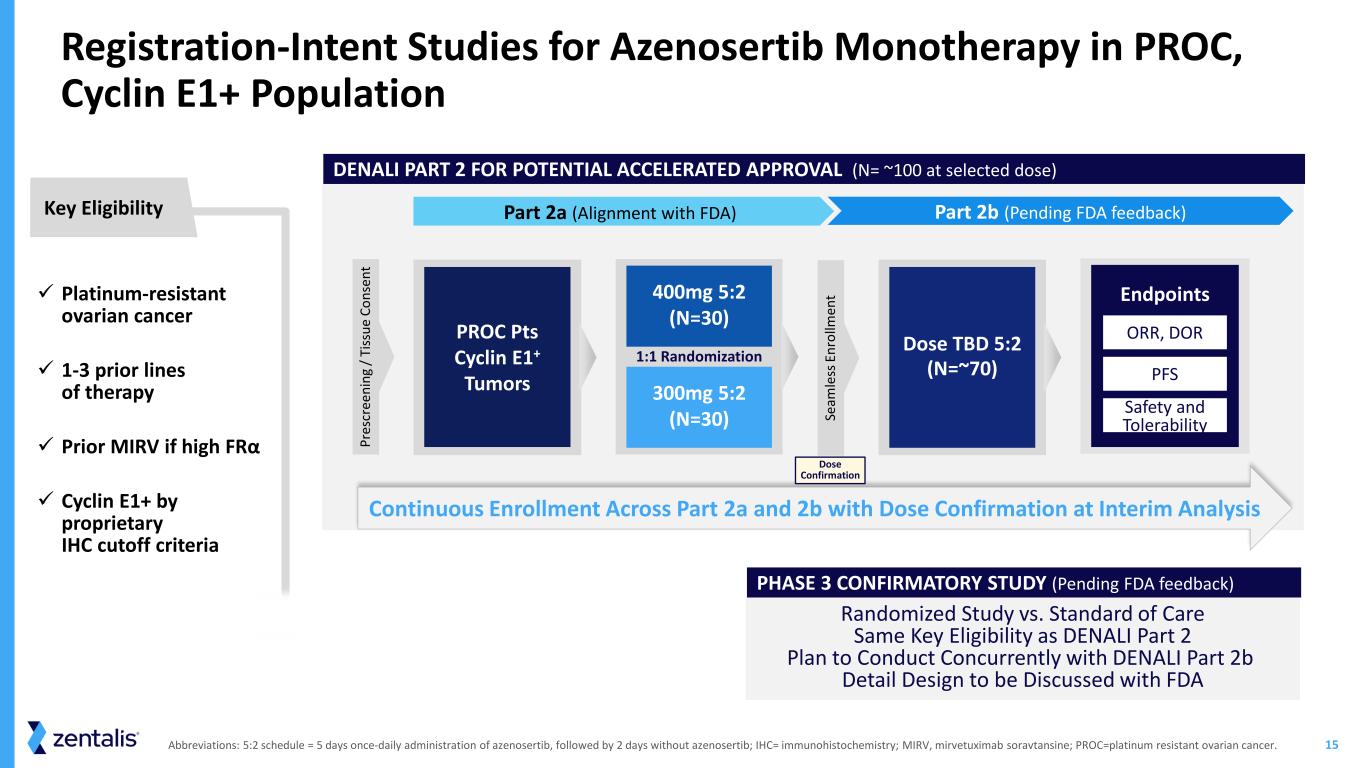 23 Registration-Intent DENALI Part 2 Topline Data Anticipated by YE2026 Cyclin E1+ / overexpression by IHC represents ~ 50%c of PROC • Cyclin E1+ IHC more than doubles the eligible patient population beyond CCNE1 amp Azenosertib demonstrates ORR of ~35% in evaluablea patients with Cyclin E1+ PROC • Median duration of response is 6.3 monthsb Cyclin E1 by IHC is a predictive biomarker for response to azenosertib Manageable safety profile • GI toxicity (nausea, diarrhea) and fatigue are the most common TRAEs; although less common, hematological toxicities require close monitoring during treatment with azenosertib Azenosertib data support further development in Cyclin E1+ PROC in Part 2 of the ongoing DENALI study DENALI aIncludes patients who received at least one post treatment scan as of the January 13, 2025 data cut off; bmDOR is subject to change, there are 4 ongoing responders as of the January 13, 2025 data cut off; c Cyclin E1 IHC+ based on Zentalis proprietary IHC cutoff and Cyclin E1 IHC assay developed from the existing clinical data; Cyclin E1 IHC+% based on literature (~20% CCNE1 amplification) and the unbiased CCNE1 amp & Cyclin E1 overlapping data generated from Zentalis clinical trial samples GI, gastrointestinal; mDOR, median duration of response; PROC, platinum-resistant ovarian cancer; TRAE, treatment-related adverse event.