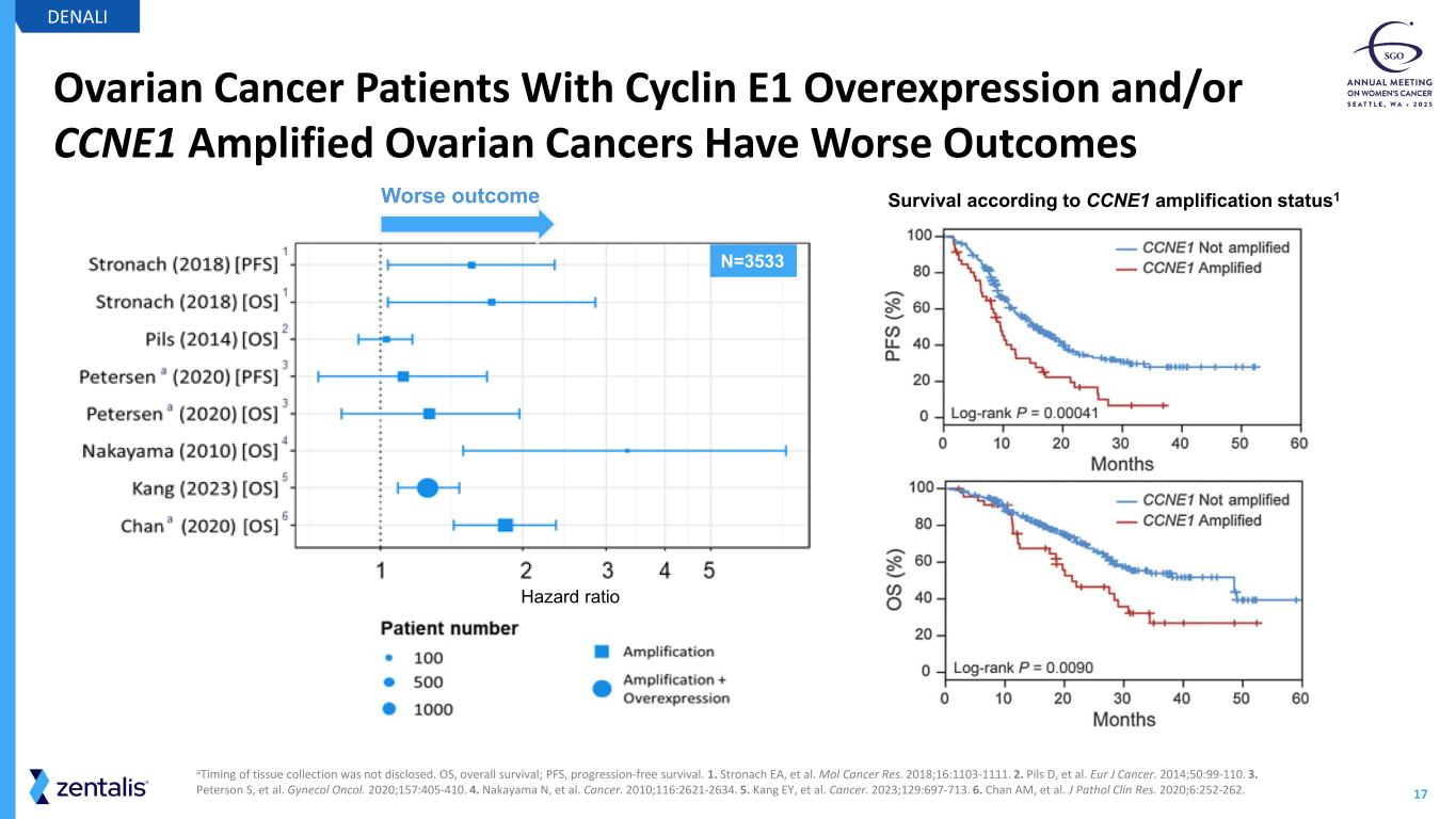 17 Ovarian Cancer Patients With Cyclin E1 Overexpression and/or CCNE1 Amplified Ovarian Cancers Have Worse Outcomes DENALI Survival according to CCNE1 amplification status1 aTiming of tissue collection was not disclosed. OS, overall survival; PFS, progression-free survival. 1. Stronach EA, et al. Mol Cancer Res. 2018;16:1103-1111. 2. Pils D, et al. Eur J Cancer. 2014;50:99-110. 3. Peterson S, et al. Gynecol Oncol. 2020;157:405-410. 4. Nakayama N, et al. Cancer. 2010;116:2621-2634. 5. Kang EY, et al. Cancer. 2023;129:697-713. 6. Chan AM, et al. J Pathol Clin Res. 2020;6:252-262. Hazard ratio N=3533 Worse outcome