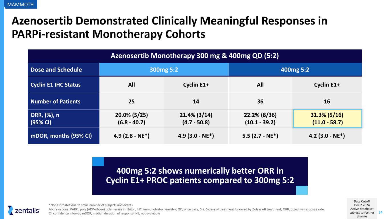 33 Well-characterized Safety and Tolerability in PROC Monotherapy Cohorts at 300mg QD and 400mg QD (5:2) Doses Neutropenia: Neutropenia, neutrophil count decreased, neutrophil percentage decreased; Thrombocytopenia: platelet count decreased and thrombocytopenia; Anemia: hematocrit decreased, hemoglobin decreased, RBC count decreased Abbreviations: AE, adverse event; TRAE, treatment related adverse event. SAE, serious adverse event. 300mg (N=25) 400mg (N=36) Treatment-related AEs*, N (%) All Grade Grade 3+ All Grade Grade 3+ Gastrointestinal Decreased appetite 7 (28.0%) 1 (4.0%) 11 (30.6%) 0 Diarrhea 13 (52.0%) 0 17 (47.2%) 4 (11.1%) Nausea 15 (60.0%) 0 19 (52.8%) 1 (2.8%) Vomiting 2 (8.0%) 0 4 (11.1%) 1 (2.8%) Dehydration 0 0 0 0 Fatigue 6 (24.0%) 1 (4.0%) 11 (30.6%) 1 (2.8%) Sepsis 0 0 1 (2.8%) 1 (2.8%) Hematologic Anemia 10 (40.0%) 3 (12.0%) 14 (38.9%) 6 (16.7%) Thrombocytopenia 8 (32.0%) 2 (8.0%) 13 (36.1%) 4 (11.1%) Neutropenia 4 (12.0%) 3 (12.0%) 8 (22.2%) 5 (13.9%) Febrile Neutropenia 0 0 1 (2.8%) 1 (2.8%) Azenosertib Monotherapy 300 mg & 400mg QD (5:2) Treatment-related AEs, N (%) 300mg (N=25) 400mg (N=36) Treatment-Related SAE 4 (16.0%) 5 (13.9%) TRAE leading to dose reduction 11 (44.0%) 15 (41.7%) TRAE leading to dose interruption 11 (44.0%) 14 (38.9%) TRAE leading to discontinuation 4 (16.0%) 2 (5.6%) TRAE leading to death 0 (0.0%) 1 (2.8%) • Similar rates of TR SAEs across doses • Low rate of TR G3+ hematological toxicities with the majority being G3 events (only one G4 febrile neutropenia and one sepsis event) • Low rate of TRAEs leading to treatment discontinuation • One G5 TRAE previously reported * TRAEs listed here represent adverse events of special interest and adverse events of clinical significance for azenosertib and this class of molecules MAMMOTH Data Cutoff Dec 2 2024 Active database; subject to further change