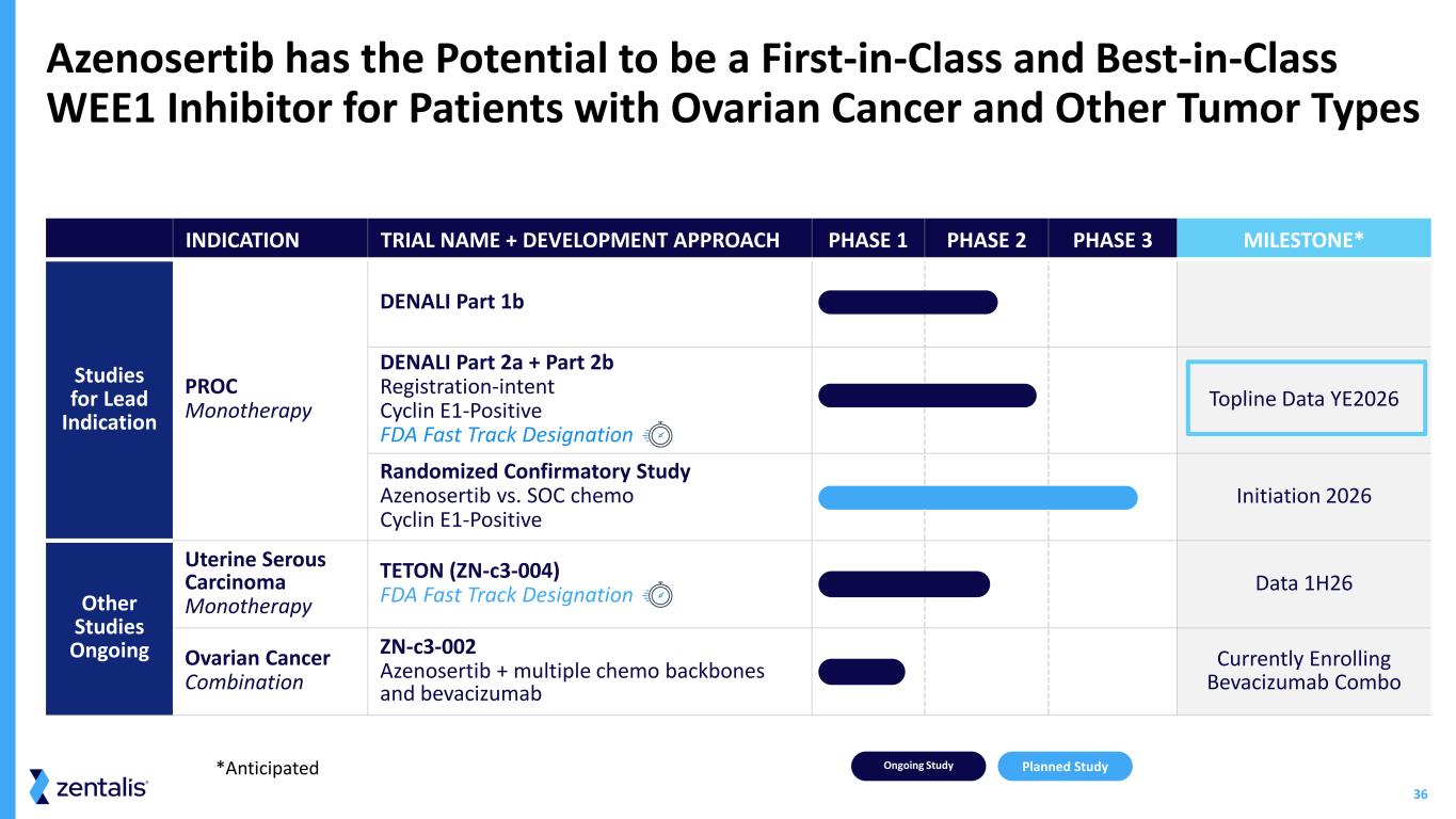 36 INDICATION TRIAL NAME + DEVELOPMENT APPROACH PHASE 1 PHASE 2 PHASE 3 MILESTONE* Studies for Lead Indication PROC Monotherapy DENALI Part 1b DENALI Part 2a + Part 2b Registration-intent Cyclin E1-Positive FDA Fast Track Designation Topline Data YE2026 Randomized Confirmatory Study Azenosertib vs. SOC chemo Cyclin E1-Positive Initiation 2026 Other Studies Ongoing Uterine Serous Carcinoma Monotherapy TETON (ZN-c3-004) FDA Fast Track Designation Data 1H26 Ovarian Cancer Combination ZN-c3-002 Azenosertib + multiple chemo backbones and bevacizumab Currently Enrolling Bevacizumab Combo Ongoing Study Planned Study*Anticipated Azenosertib has the Potential to be a First-in-Class and Best-in-Class WEE1 Inhibitor for Patients with Ovarian Cancer and Other Tumor Types
