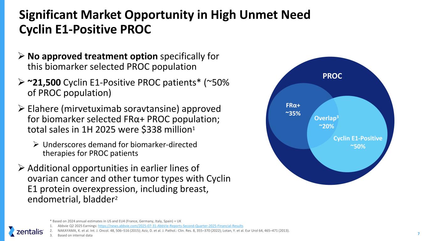 6 Multiple Drivers of Cyclin E1 Protein Overexpression Companion diagnostic ready for use in registration-intent studies to identify Cyclin E1-Positive patients, ~50% of PROC patient population† 1. Kim, D., et al. Cyclin E1/CDK2 activation defines a key vulnerability to WEE1 kinase inhibition in gynecological cancers, npj Precis. Onc. 9, 3 (2025). https://doi.org/10.1038/s41698-024-00787-4 * Cyclin E1 IHC+ based on Zentalis proprietary IHC cutoff and Cyclin E1 IHC assay developed from the existing clinical data † Cyclin E1 IHC+% based on literature and the unbiased CCNE1 amp & Cyclin E1 overlapping data generated from Zentalis clinical trial samples IHC - immunohistochemistry All PROC patients, regardless of CCNE1 amplification status, should be screened for Cyclin E1 overexpression Cyclin E1 overexpression driven by different mechanisms1, including: • CCNE1 gene amplification • Increased gene transcription • Reduced protein degradation Cyclin E1-Positivity more than doubles the eligible patient population beyond CCNE1 gene amplified: ~15% Negative ~85% Positive CCNE1 Non-Amplified Predicted Cyclin E1 IHC * CCNE1 Amplified ~40% Positive~60% Negative
