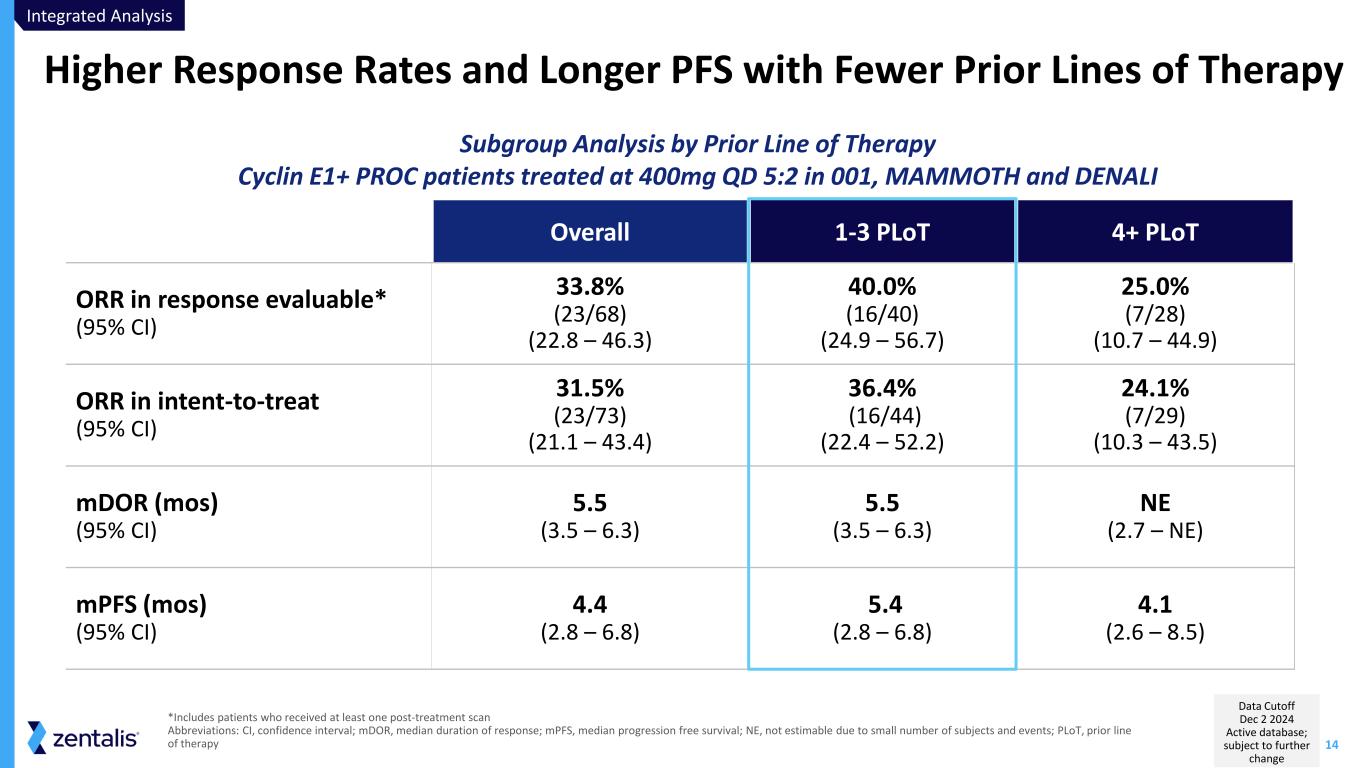 13 *Includes patients who received at least one post-treatment scan Abbreviations: CI, confidence interval; cPR, confirmed partial response; mDOR, median duration of response; PD, progressive disease; SD, stable disease; NE, not estimable due to small number of subjects and events. 400mg 5:2 Shows Meaningful Response Rates >30% and mDOR >5 mos + + + + + + + + +-100 — -80 — -60 — -40 — -20 — 0 — 20 — 40 — 60 — 80 — 100 — Be st P er ce nt C ha ng e fr om B as el in e in S um o f D ia m et er (% ) PR PD 300mg 5:2 (N=18) 400mg 5:2 (N=68) PDSDcPRBest Overall Response # # # # # # # # # ‡ ‡ ‡ + = treatment ongoing # = best % change ~0% ‡ = received a post-baseline scan as SD but did not qualify as SD due to the post-baseline scan occurring outside of a protocol defined window Integrated Analysis Data Cutoff Dec 2 2024 Active database; subject to further change PROC, Cyclin E1+ 300 mg 5:2 400 mg 5:2 ORR in response evaluable* (95% CI) 22.2% (4/18) (6.4 - 47.6) 33.8% (23/68) (22.8 - 46.3) ORR in intent-to-treat (95% CI) 20.0% (4/20) (5.7 – 43.7) 31.5% (23/73) (21.1 – 43.4) mDOR (mos) (95% CI) 3.9 (2.8, NE) 5.5 (3.5, 6.3) mPFS (mos) (95% CI) 4.1 (1.3, 6.6) 4.4 (2.8, 6.8)