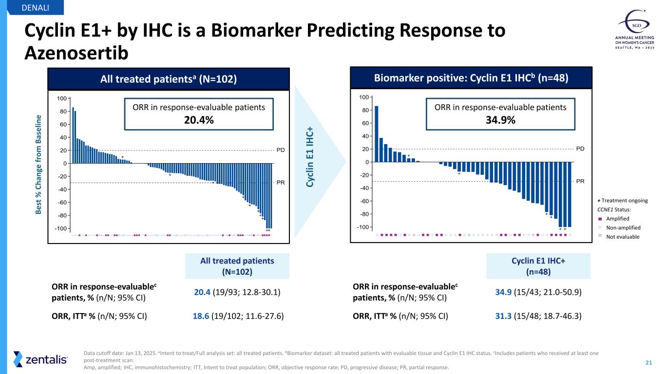 20 DENALI Part 1b: Patient Baseline Characteristics DENALI Data cutoff date: January 13, 2025. aFull analysis set: all treated patients. Biomarker dataset: all treated patients with evaluable tissue and Cyclin E1 IHC status. bHispanic. c85% (23/27) of patients with CCNE1-amplified tumors were also Cyclin E1+ by IHC. Amp, amplified; CCNE1 amplification defined as Copy Number ratio ≥3 with genomic ploidy correction as per Foundation Medicine. ECOG PS, Eastern Cooperative Oncology Group performance status; IHC, immunohistochemistry; PARPi, poly(ADP-ribose) polymerase inhibitor. Characteristicsa (N=102) Median age (range), years 66 (34-82) Race, n (%) White 70 (69) Black/African American 6 (6) Asian 3 (3) Otherb 1 (1) Not reported 22 (22) ECOG PS, n (%) 0 53 (52) 1 49 (48) Prior lines of treatment Median (range) 3 (1-5) 1-2, n (%) 35 (34) 3-4, n (%) 57 (56) 5, n (%) 10 (10) Characteristicsa (N=102) Prior therapy, n (%) Bevacizumab 93 (91) PARPi 57 (56) Mirvetuximab 15 (15) CCNE1 amplification,c Evaluable, n 88 Amplified, n (%) 27 (31) Cyclin E1 status by IHC Evaluable, n 94 IHC+, n (%) 48 (51) • Heavily pre-treated population: >65% with 3+ lines of therapy • ~50% of patients identified with Cyclin E1 overexpression per Zentalis IHC assay