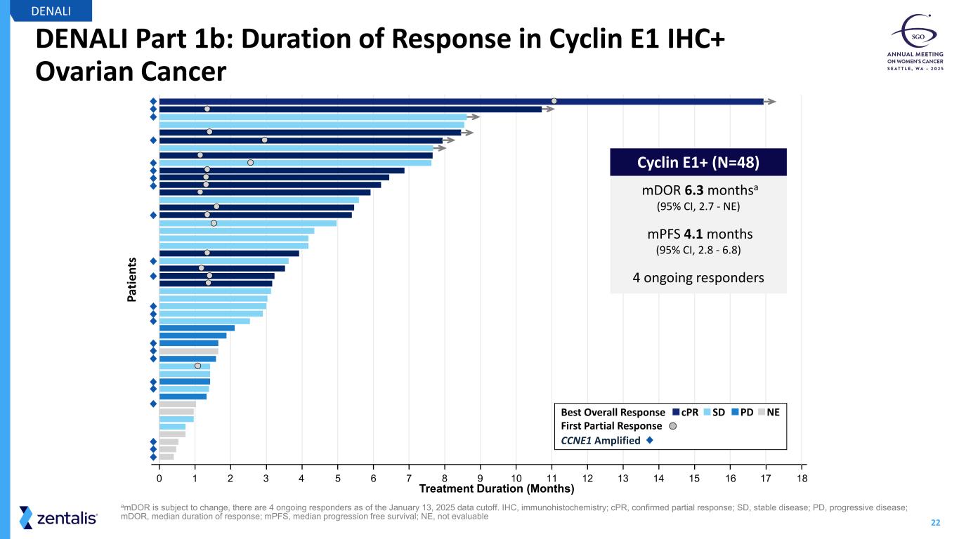 21 Cyclin E1+ by IHC is a Biomarker Predicting Response to Azenosertib DENALI Data cutoff date: Jan 13, 2025. aIntent to treat/Full analysis set: all treated patients. bBiomarker dataset: all treated patients with evaluable tissue and Cyclin E1 IHC status. cIncludes patients who received at least one post-treatment scan. Amp, amplified; IHC, immunohistochemistry; ITT, Intent to treat population; ORR, objective response rate; PD, progressive disease; PR, partial response. All treated patients (N=102) ORR in response-evaluablec patients, % (n/N; 95% CI) 20.4 (19/93; 12.8-30.1) ORR, ITTa % (n/N; 95% CI) 18.6 (19/102; 11.6-27.6) Cyclin E1 IHC+ (n=48) ORR in response-evaluablec patients, % (n/N; 95% CI) 34.9 (15/43; 21.0-50.9) ORR, ITTa % (n/N; 95% CI) 31.3 (15/48; 18.7-46.3) All treated patientsa (N=102) Cy cl in E 1 IH C+ Biomarker positive: Cyclin E1 IHCb (n=48) ORR in response-evaluable patients 20.4% ORR in response-evaluable patients 34.9% + Treatment ongoing CCNE1 Status: Amplified Non-amplified Not evaluable Be st % C ha ng e fr om B as el in e