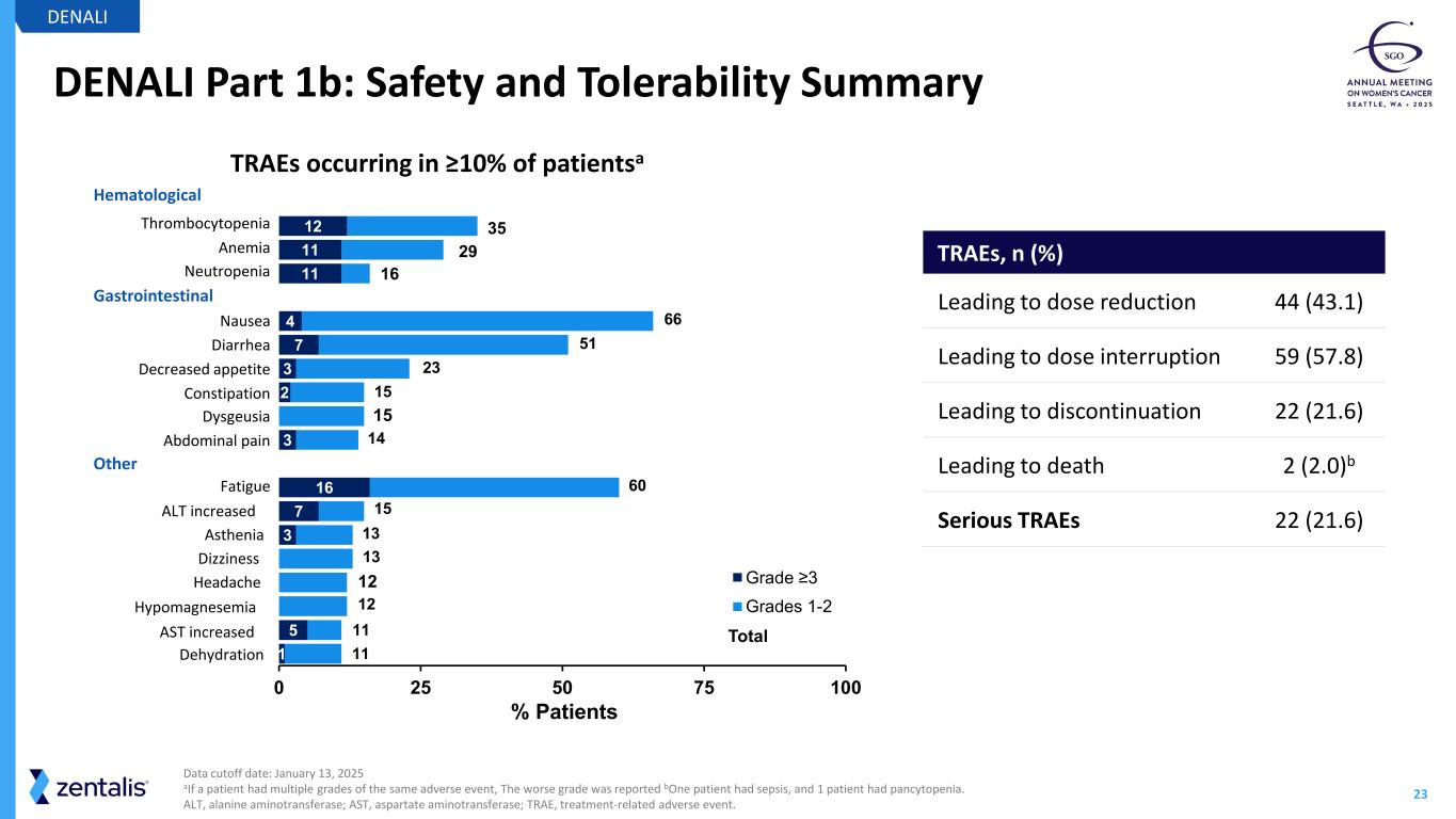 22 DENALI Part 1b: Duration of Response in Cyclin E1 IHC+ Ovarian Cancer DENALI amDOR is subject to change, there are 4 ongoing responders as of the January 13, 2025 data cutoff. IHC, immunohistochemistry; cPR, confirmed partial response; SD, stable disease; PD, progressive disease; mDOR, median duration of response; mPFS, median progression free survival; NE, not evaluable 17 180 1 2 3 4 5 6 7 8 9 10 11 12 13 14 15 16 Pa tie nt s Treatment Duration (Months) mDOR 6.3 monthsa (95% CI, 2.7 - NE) mPFS 4.1 months (95% CI, 2.8 - 6.8) 4 ongoing responders Cyclin E1+ (N=48) PDSDcPRBest Overall Response First Partial Response CCNE1 Amplified NE
