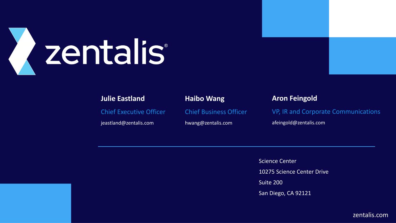zentalis.com Science Center 10275 Science Center Drive Suite 200 San Diego, CA 92121 Julie Eastland Chief Executive Officer jeastland@zentalis.com Haibo Wang Chief Business Officer hwang@zentalis.com Aron Feingold VP, IR and Corporate Communications afeingold@zentalis.com