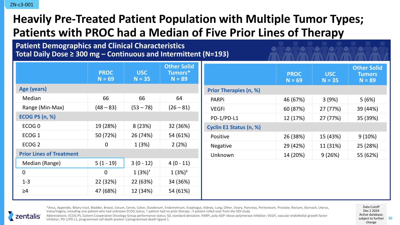 29 Total Enrollment First-in-Human Phase 1 Dose and Schedule Optimization in Solid Tumors: Therapeutic Window Established N=274 across all tumor types and dose* N=193 at total daily dose ≥ 300mg; evaluated for safety and anti-tumor activity ZN-c3-001 * Total enrollment (N=274) included cohorts for food effect (N=17) and relative bioavailability (N=38) Abbreviations: CRM, continual reassessment method; QD, once daily; BID, twice daily; 5:2, 5-days of treatment followed by 2-days off treatment; 4:3, 4-days of treatment followed by 3-days off treatment; DLT, dose limiting toxicity; PROC, platinum resistant ovarian cancer; USC, uterine serous carcinoma Intermittent Dosing Dose finding (CRM) Expansion (N=57)Dose Escalation (N=63) 450mg 500mg 400mg 400mg QD 5:2 350mg QD & 175mg BID 350mg QD 5:2 300mg QD 5:2 Total daily dose, 5:2 or 4:3 schedule Continuous Dosing Dose Escalation (N=59) Expansion (N=40) 450mg 200mg 400mg 350mg Lower doses (25-100mg) 300mg 300mg QD 200mg QD Total daily dose ≥ 300mg, including 175mg BID (N=193) Total daily dose < 300mg (N=26) Key Eligibility Status 1+ prior lines of therapy Solid tumor, PROC and USC enriched Tissue collected for biomarker analysis Fully Enrolled Optimal Dose Range