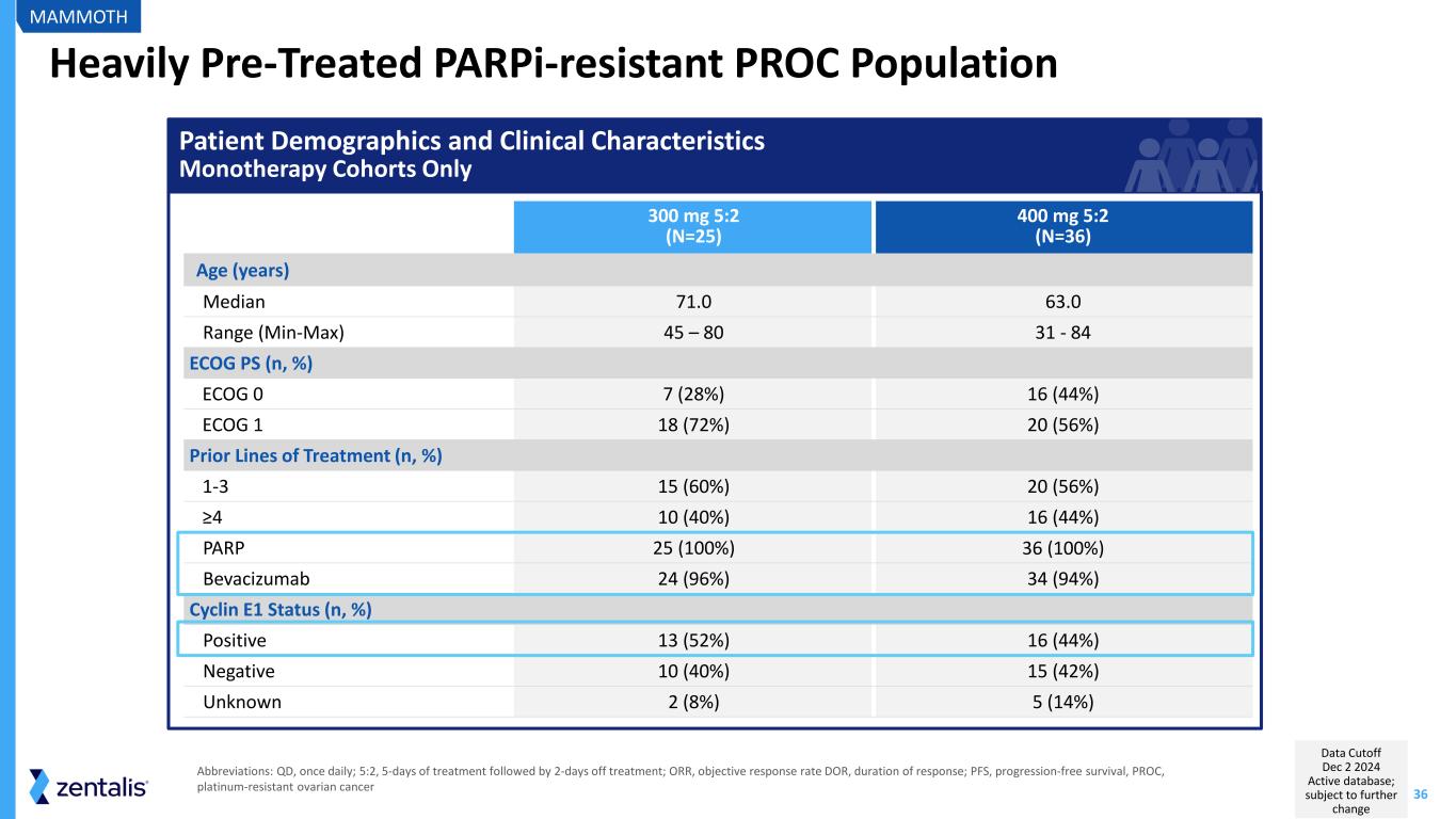 35 MAMMOTH: Two Clinically-active Monotherapy Doses Studied in Heavily Pre-treated, PARPi-resistant PROC Patient Population Study Design 1-5 prior lines of therapy Platinum-resistant, progressed while receiving an approved PARP inhibitor Mandatory sufficient tissue for biomarker analysis Key Eligibility MAMMOTH Abbreviations: QD, once daily; 5:2, 5-days of treatment followed by 2-days off treatment; ORR, objective response rate DOR, duration of response; PFS, progression-free survival; PROC, platinum-resistant ovarian cancer; PARPi, poly (ADP-ribose) polymerase inhibitor Azenosertib + niraparib Concurrent schedule (N=28) Azenosertib + niraparib Alternating schedule (N=28) Azenosertib monotherapy 300 or 400 mg QD 5:2 (N=61) PFS Safety and Tolerability ORR, DOR Endpoints Enrollment (N=117) Enrollment CompleteStatus