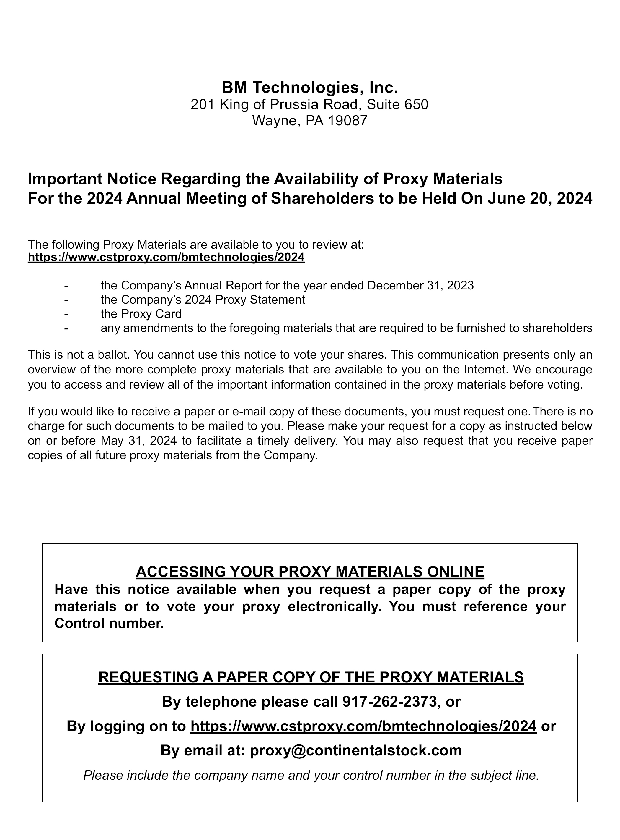 BM Technologies, Inc. 201 King of Prussia Road, Suite 650 Wayne, PA 19087 Important Notice Regarding the Availability of Proxy Materials For the 2024 Annual Meeting of Shareholders to be Held On June 20, 2024 The following Proxy Materials are available to you to review at: https://www.cstproxy.com/bmtechnologies/2024 the Company’s Annual Report for the year ended December 31, 2023 the Company’s 2024 Proxy Statement the Proxy Card any amendments to the foregoing materials that are required to be furnished to shareholders This is not a ballot. You cannot use this notice to vote your shares. This communication presents only an overview of the more complete proxy materials that are available to you on the Internet. We encourage you to access and review all of the important information contained in the proxy materials before voting. If you would like to receive a paper or e-mail copy of these documents, you must request one. There is no charge for such documents to be mailed to you. Please make your request for a copy as instructed below on or before May 31, 2024 to facilitate a timely delivery. You may also request that you receive paper copies of all future proxy materials from the Company. ACCESSING YOUR PROXY MATERIALS ONLINE Have this notice available when you request a paper copy of the proxy materials or to vote your proxy electronically. You must reference your Control number. REQUESTING A PAPER COPY OF THE PROXY MATERIALS By telephone please call 917-262-2373, or By logging on to https://www.cstproxy.com/bmtechnologies/2024 or By email at: proxy@continentalstock.com Please include the company name and your control number in the subject line.