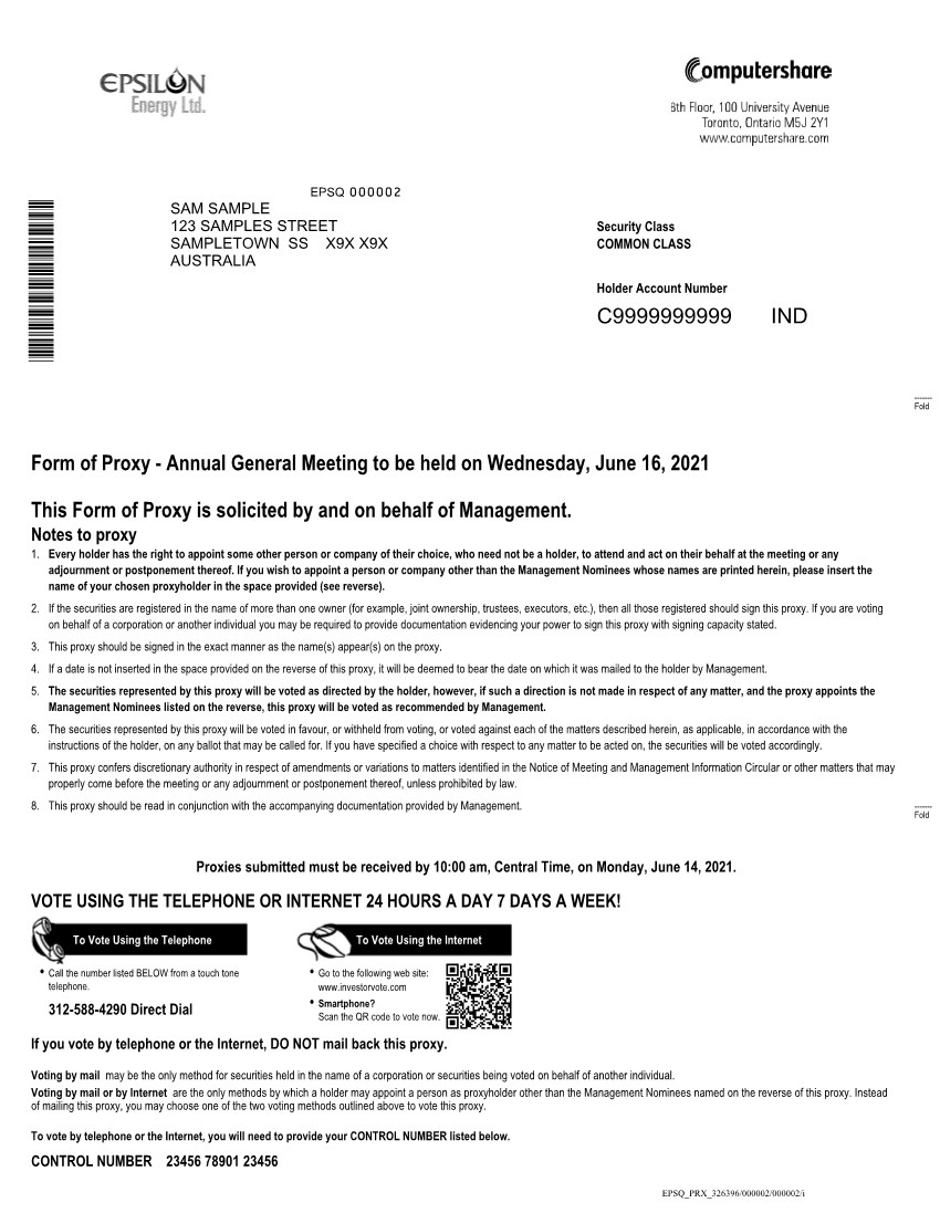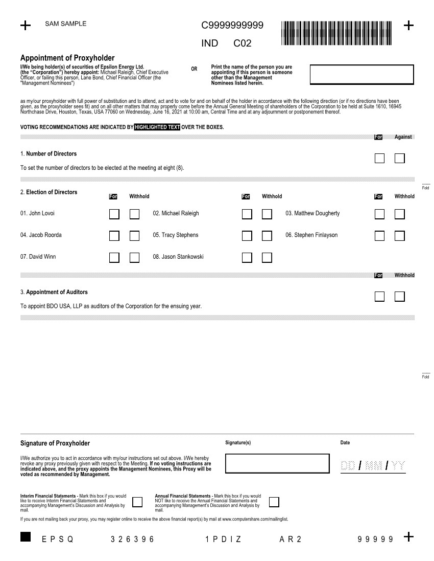 SAM SAMPLEC9999999999 *C9999999999*Appointment of ProxyholderINDC02*C9999999999*I/We being holder(s) of securities of Epsilon Energy Ltd. (the “Corporation”) hereby appoint: Michael Raleigh, Chief Executive Officer, or failing this person, Lane Bond, Chief Financial Officer (the "Management Nominees")OR Print the name of the person you are appointing if this person is someone other than the Management Nominees listed herein.as my/our proxyholder with full power of substitution and to attend, act and to vote for and on behalf of the holder in accordance with the following direction (or if no directions have been given, as the proxyholder sees fit) and on all other matters that may properly come before the Annual General Meeting of shareholders of the Corporation to be held at Suite 1610, 16945 Northchase Drive, Houston, Texas, USA 77060 on Wednesday, June 16, 2021 at 10:00 am, Central Time and at any adjournment or postponement thereof.VOTING RECOMMENDATIONS ARE INDICATED BY HIGHLIGHTED TEXT OVER THE BOXES. For Against1. Number of DirectorsTo set the number of directors to be elected at the meeting at eight (8).2. Election of Directors01. John LovoiFor Withhold02. Michael RaleighFor Withhold03. Matthew DoughertyFor Withhold------- Fold04. Jacob Roorda 05. Tracy Stephens 06. Stephen Finlayson07. David Winn 08. Jason StankowskiFor Withhold3. Appointment of AuditorsTo appoint BDO USA, LLP as auditors of the Corporation for the ensuing year.------- FoldSignature of ProxyholderI/We authorize you to act in accordance with my/our instructions set out above. I/We hereby revoke any proxy previously given with respect to the Meeting. If no voting instructions are indicated above, and the proxy appoints the Management Nominees, this Proxy will be voted as recommended by Management.Signature(s) DateInterim Financial Statements - Mark this box if you would like to receive Interim Financial Statements and accompanying Management’s Discussion and Analysis by mail.Annual Financial Statements - Mark this box if you would NOT like to receive the Annual Financial Statements and accompanying Management’s Discussion and Analysis by mail.If you are not mailing back your proxy, you may register online to receive the above financial report(s) by mail at www.computershare.com/mailinglist.E P S Q3 2 6 3 9 6 1 P D I Z A R 29 9 9 9 9
