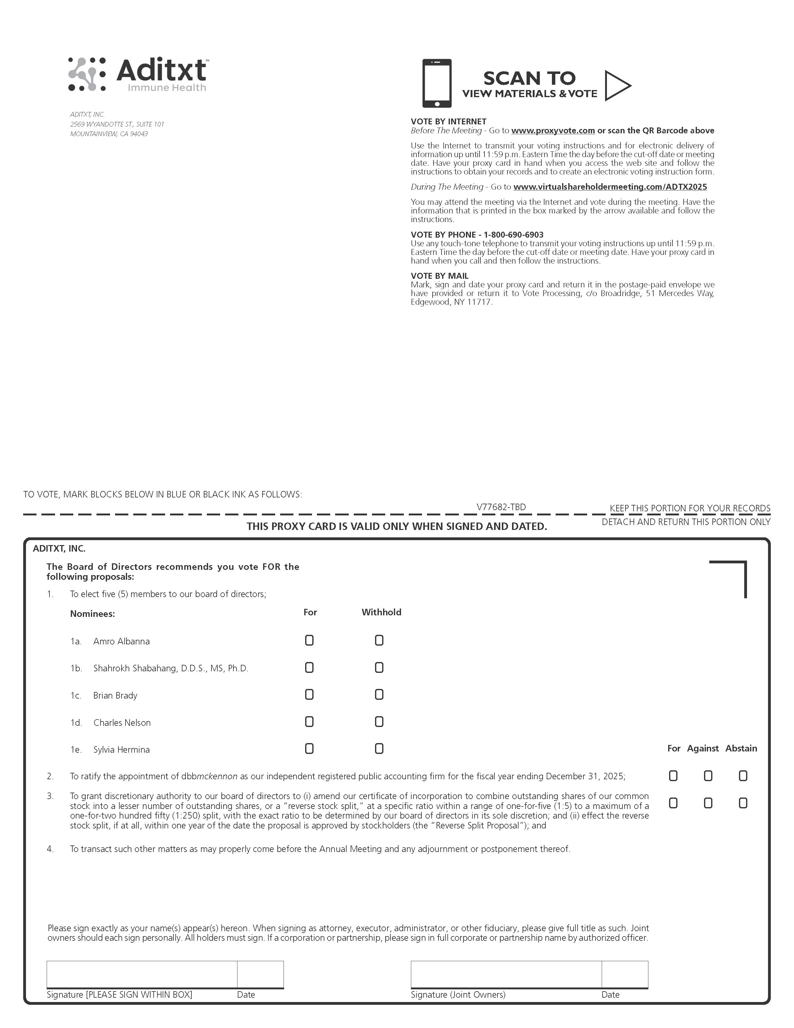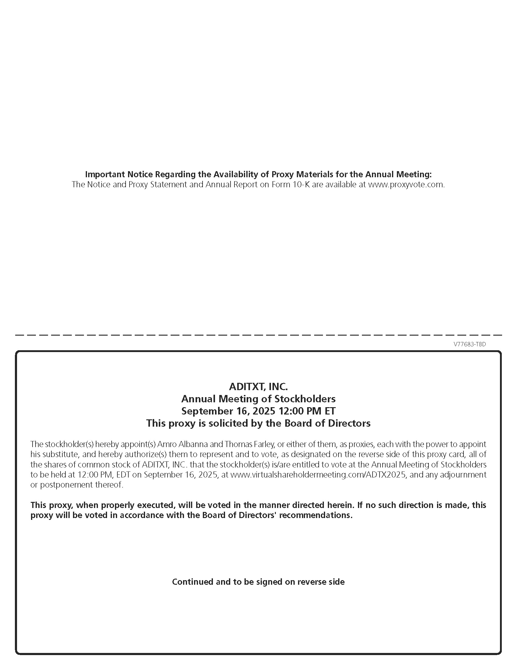 The board of directors of Aditxt, Inc. (“Aditxt” or the “Company”) is soliciting your proxy to vote at the Annual Meeting of Stockholders (the “Annual Meeting”) to be held on September 16, 2025, at 12:00 PM ET, in a virtual-only format online by accessing www.virtualshareholdermeeting.com/ADTX2025 and at any adjournment thereof.