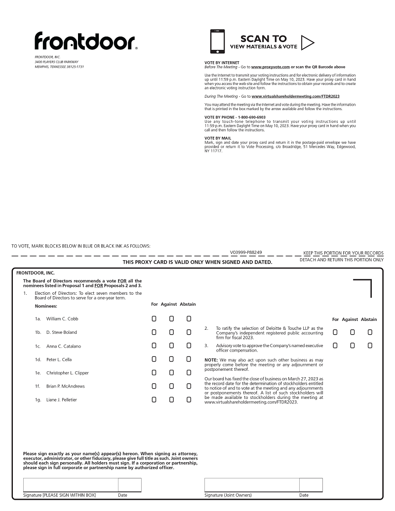 You may also obtain information regarding access to the 2023 Annual Meeting by contacting our investor relations representative at IR@frontdoorhome.com. This Proxy Statement contains information about the items stockholders will vote on at the 2023 Annual Meeting.