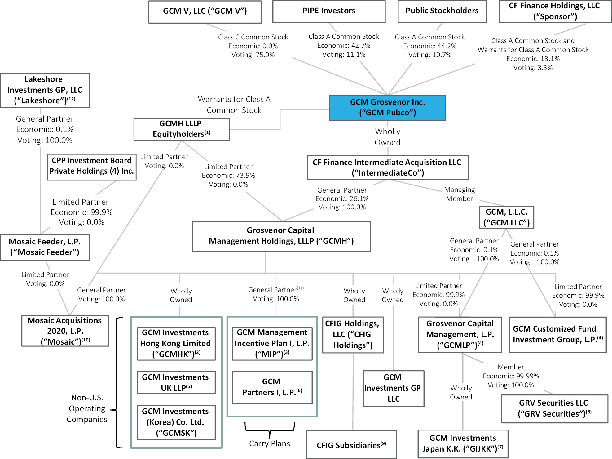 Immediately following the Merger and in accordance with the Transaction Agreement, a series of transactions will occur whereby (i) certain third-party investors will purchase an aggregate of 19,500,000 shares of Class A common stock of GCM PubCo, par value $0.0001 per share (“GCM Class A common stock”) for an aggregate purchase price of $195,000,000, (ii) the Sponsor will purchase 3,500,000 shares of GCM Class A common stock and 1,500,000 warrants to purchase GCM Class A common stock (which shall be in the identical form of the private placement warrants of CFAC) (“GCM PubCo private placement warrants”) for an aggregate purchase price of $30,000,000, (iii) the Sponsor will forfeit 2,351,534 shares of GCM Class A common stock and 150,000 GCM PubCo private placement warrants, (iv) GCM PubCo will issue 900,000 GCM PubCo private placement warrants to Holdings, (v) Holdings will assign its option to purchase certain limited partnership interests in GCMH to IntermediateCo for an amount calculated in accordance with the Transaction Agreement, and IntermediateCo will acquire such limited partnership interests for an amount calculated in accordance with the Transaction Agreement and such option, (vi) Holdings will have the right to require IntermediateCo to acquire certain limited partnership interests in GCMH from Holdings for an aggregate purchase price of up to $38,079,389.50, (vii) GCMHGP LLC will transfer its general partnership interest and limited partnership interests in GCMH to IntermediateCo for an amount calculated in accordance with the Transaction Agreement and Holdings will transfer all of the outstanding equity interests of GCM, L.L.C., a Delaware limited liability company, to IntermediateCo for an amount calculated in accordance with the Transaction Agreement, (viii) GCMH will be redomiciled as a Delaware limited liability limited partnership and its limited partnership agreement will be amended and restated, (ix) IntermediateCo will make a cash capital contribution to GCMH in exchange for common units of GCMH and warrants to purchase common units of GCMH, and (x) GCM PubCo will issue a number of shares of its Class C common stock to GCM V as calculated in accordance with the Transaction Agreement. As a result of the business combination, assuming (x) no redemptions of shares of CFAC Class A common stock in connection with the business combination and (y) Holdings’ sale of $38,079,389.50 of limited partnership interests in GCMH to IntermediateCo pursuant to clause (vi) above, the GCMH Equityholders will hold approximately 73.9% of the common units of GCMH and IntermediateCo will hold approximately 26.1% of the common units of GCMH.