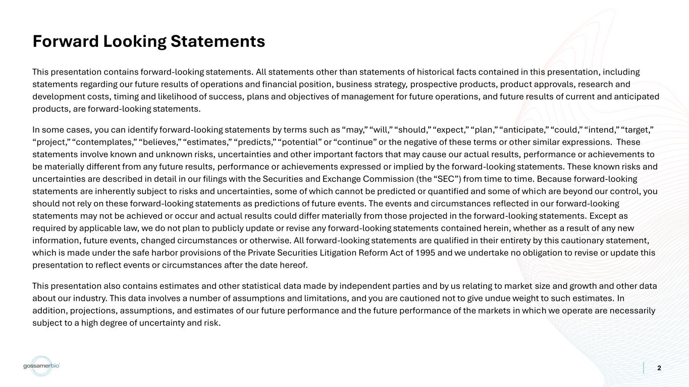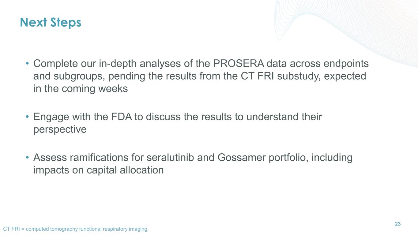 Next Steps CT FRI = computed tomography functional respiratory imaging. 23 • Complete our in-depth analyses of the PROSERA data across endpoints and subgroups, pending the results from the CT FRI substudy, expected in the coming weeks • Engage with the FDA to discuss the results to understand their perspective • Assess ramifications for seralutinib and Gossamer portfolio, including impacts on capital allocation