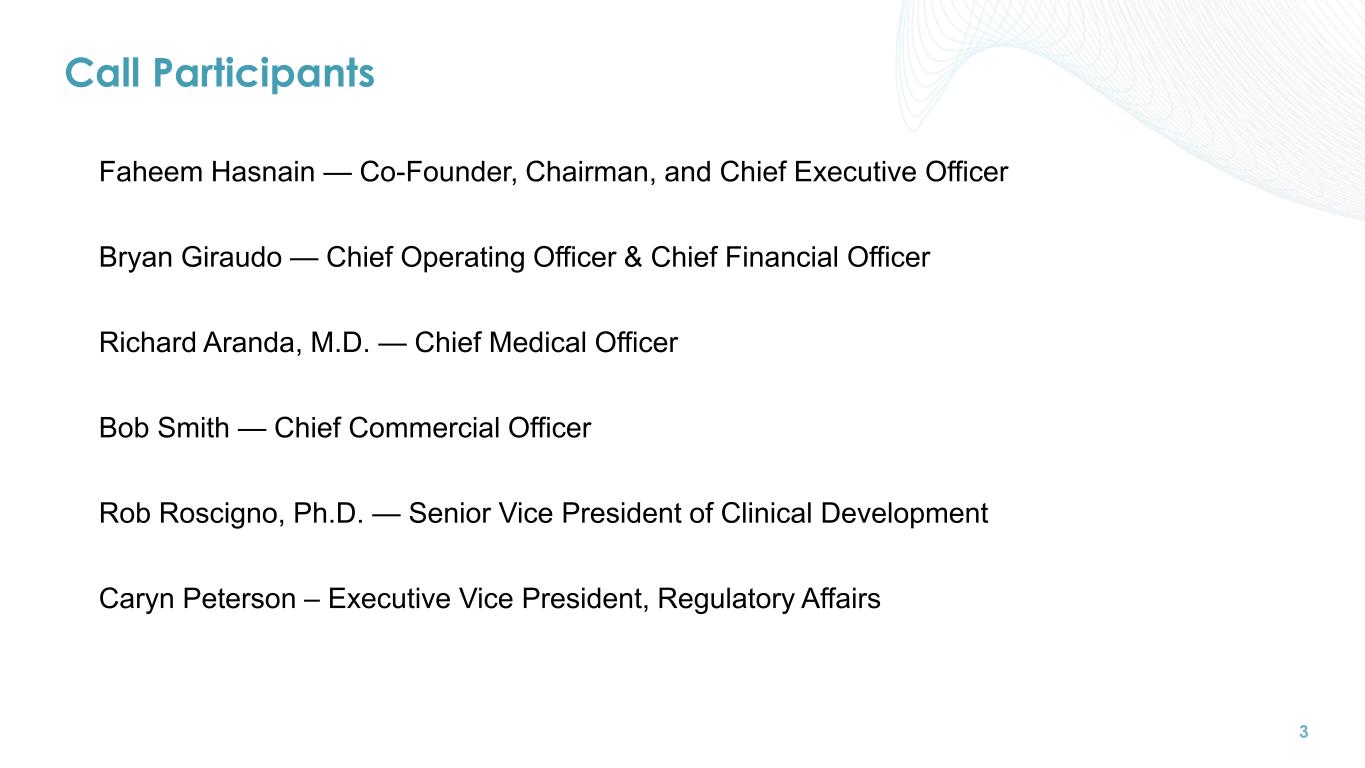 Call Participants 3 Faheem Hasnain — Co-Founder, Chairman, and Chief Executive Officer Bryan Giraudo — Chief Operating Officer & Chief Financial Officer Richard Aranda, M.D. — Chief Medical Officer Bob Smith — Chief Commercial Officer Rob Roscigno, Ph.D. — Senior Vice President of Clinical Development Caryn Peterson – Executive Vice President, Regulatory Affairs
