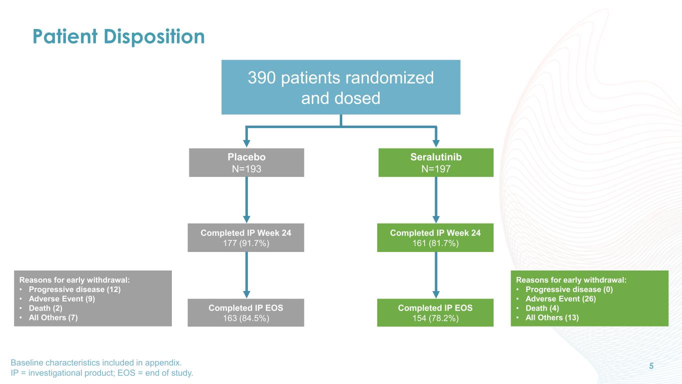 Phase 3 PROSERA Trial Design 4 Open Label Extension (OLE) Period Double Blind Placebo- Controlled Treatment Period (24 weeks) Patients with PAH Seralutinib 90 mg BID; n ≈ 175 Placebo BID; n ≈ 175 Seralutinib 90 mg BID Primary Endpoint (Δ in 6MWD) Evaluated at Week 24 Key Secondary Endpoints at Week 24: • Δ in NT-proBNP • Clinical Improvement • Reduction of REVEAL Lite Risk Score Key Secondary Endpoint (Time to Clinical Worsening) Evaluated out to 48 Weeks Placebo-Controlled Treatment Period (48 Weeks) Extended Double-Blind Treatment (up to an add’l 24 weeks) BID = twice-daily; 6MWD = 6-minute walk distance.