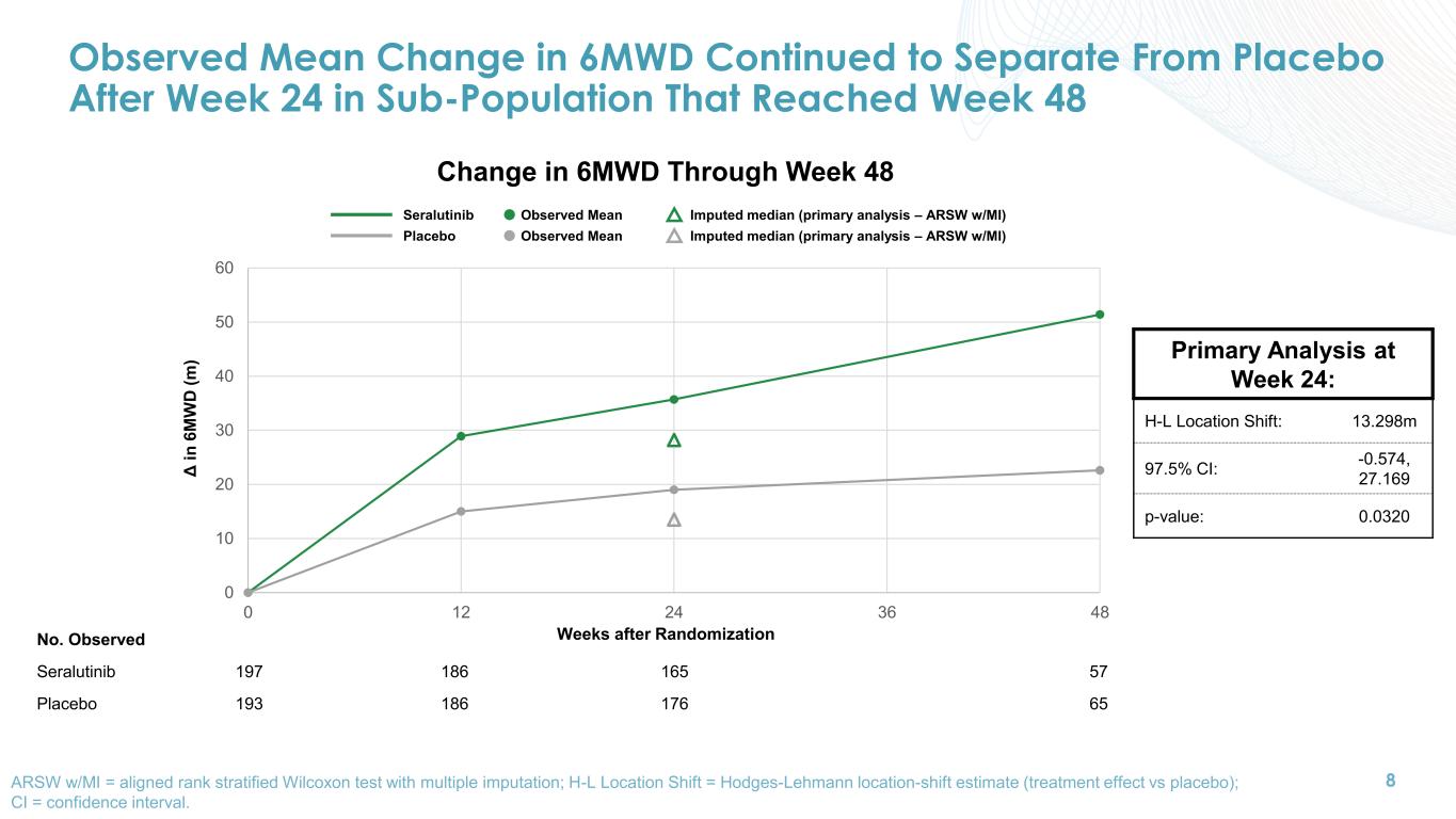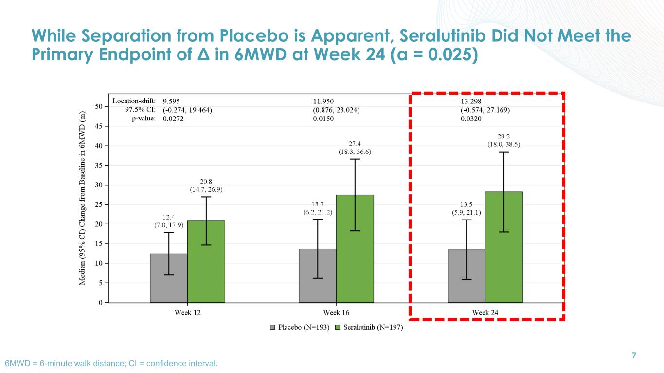 While Separation from Placebo is Apparent, Seralutinib Did Not Meet the Primary Endpoint of Δ in 6MWD at Week 24 (α = 0.025) 6MWD = 6-minute walk distance; CI = confidence interval. 7