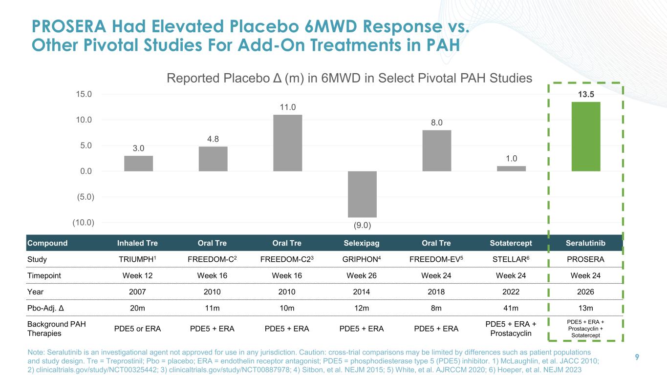 Observed Mean Change in 6MWD Continued to Separate From Placebo After Week 24 in Sub-Population That Reached Week 48 ARSW w/MI = aligned rank stratified Wilcoxon test with multiple imputation; H-L Location Shift = Hodges-Lehmann location-shift estimate (treatment effect vs placebo); CI = confidence interval. 8 No. Observed Seralutinib 197 186 165 57 Placebo 193 186 176 65 Weeks after Randomization Seralutinib Placebo Observed Mean Observed Mean Imputed median (primary analysis – ARSW w/MI) Imputed median (primary analysis – ARSW w/MI) Primary Analysis at Week 24: H-L Location Shift: 13.298m 97.5% CI: -0.574, 27.169 p-value: 0.0320 Change in 6MWD Through Week 48 Δ i n 6 M W D ( m ) 0 10 20 30 40 50 60 0 12 24 36 48