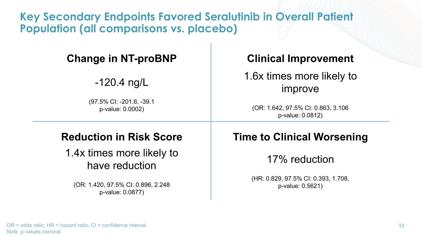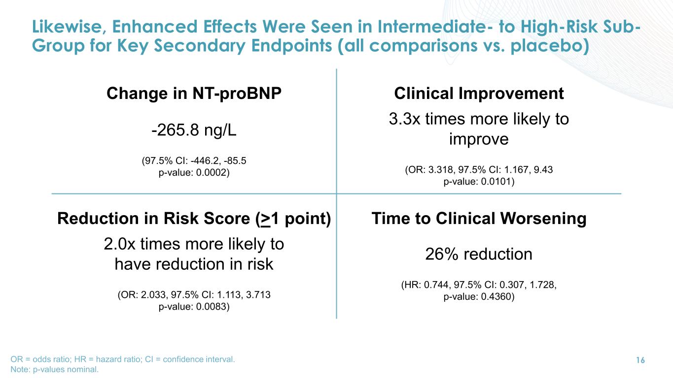 Likewise, Enhanced Effects Were Seen in Intermediate- to High-Risk Sub- Group for Key Secondary Endpoints (all comparisons vs. placebo) 16 Time to Clinical Worsening Change in NT-proBNP Clinical Improvement Reduction in Risk Score (>1 point) 26% reduction (HR: 0.744, 97.5% CI: 0.307, 1.728, p-value: 0.4360) -265.8 ng/L (97.5% CI: -446.2, -85.5 p-value: 0.0002) 3.3x times more likely to improve (OR: 3.318, 97.5% CI: 1.167, 9.43 p-value: 0.0101) 2.0x times more likely to have reduction in risk (OR: 2.033, 97.5% CI: 1.113, 3.713 p-value: 0.0083) OR = odds ratio; HR = hazard ratio; CI = confidence interval. Note: p-values nominal.