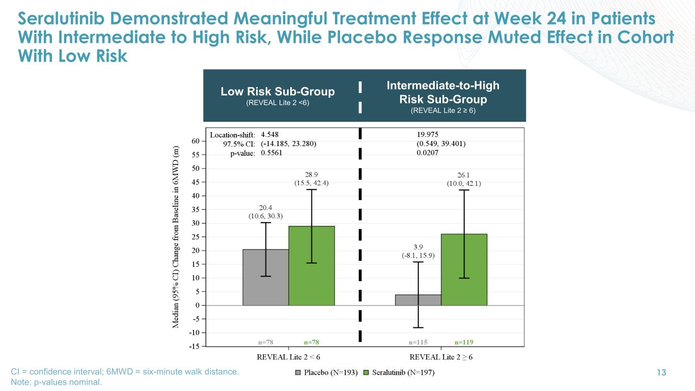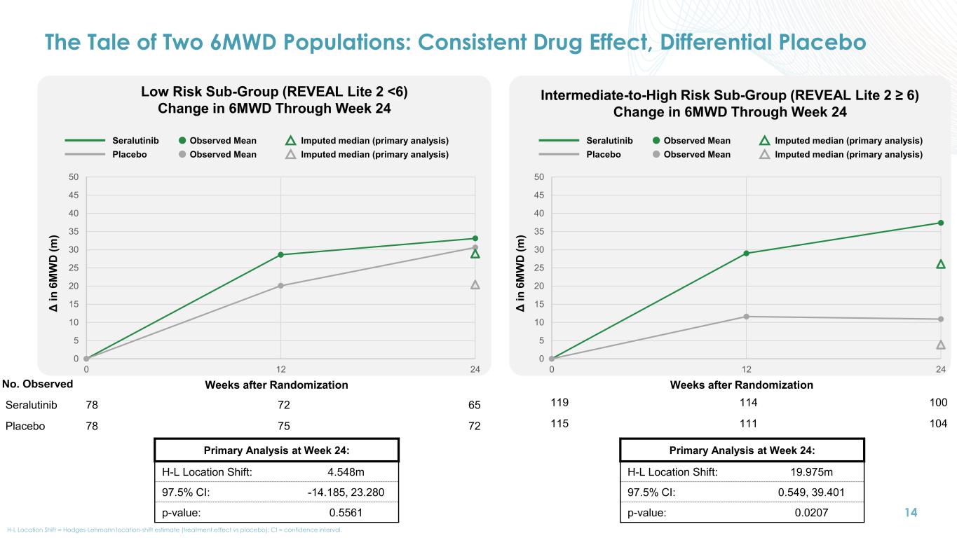 Seralutinib Demonstrated Meaningful Treatment Effect at Week 24 in Patients With Intermediate to High Risk, While Placebo Response Muted Effect in Cohort With Low Risk 13 Low Risk Sub-Group (REVEAL Lite 2 <6) Intermediate-to-High Risk Sub-Group (REVEAL Lite 2 ≥ 6) CI = confidence interval; 6MWD = six-minute walk distance. Note: p-values nominal.
