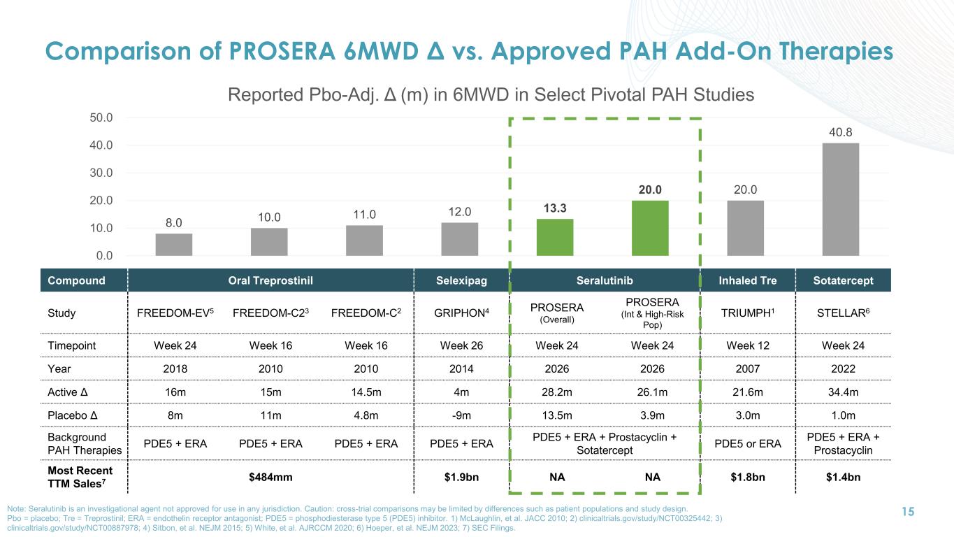 The Tale of Two 6MWD Populations: Consistent Drug Effect, Differential Placebo 14 No. Observed Seralutinib 78 72 65 Placebo 78 75 72 Weeks after Randomization Seralutinib Placebo Observed Mean Observed Mean Imputed median (primary analysis) Imputed median (primary analysis) Low Risk Sub-Group (REVEAL Lite 2 <6) Change in 6MWD Through Week 24 0 5 10 15 20 25 30 35 40 45 50 0 12 24 0 5 10 15 20 25 30 35 40 45 50 0 12 24 119 114 100 115 111 104 Weeks after Randomization Seralutinib Placebo Observed Mean Observed Mean Imputed median (primary analysis) Imputed median (primary analysis) Intermediate-to-High Risk Sub-Group (REVEAL Lite 2 ≥ 6) Change in 6MWD Through Week 24 Primary Analysis at Week 24: H-L Location Shift: 4.548m 97.5% CI: -14.185, 23.280 p-value: 0.5561 Primary Analysis at Week 24: H-L Location Shift: 19.975m 97.5% CI: 0.549, 39.401 p-value: 0.0207 Δ i n 6 M W D ( m ) Δ i n 6 M W D ( m ) H-L Location Shift = Hodges-Lehmann location-shift estimate (treatment effect vs placebo); CI = confidence interval.