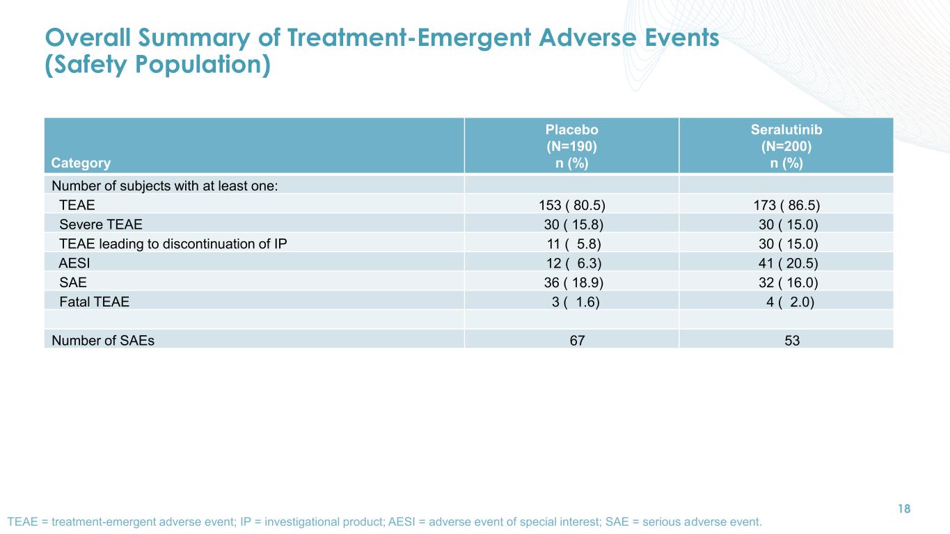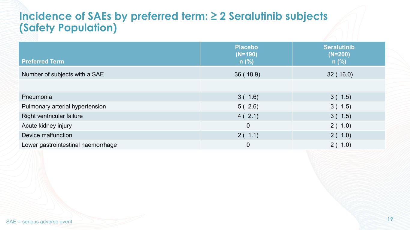Overall Summary of Treatment-Emergent Adverse Events (Safety Population) TEAE = treatment-emergent adverse event; IP = investigational product; AESI = adverse event of special interest; SAE = serious adverse event. 18 Category Placebo (N=190) n (%) Seralutinib (N=200) n (%) Number of subjects with at least one: TEAE 153 ( 80.5) 173 ( 86.5) Severe TEAE 30 ( 15.8) 30 ( 15.0) TEAE leading to discontinuation of IP 11 ( 5.8) 30 ( 15.0) AESI 12 ( 6.3) 41 ( 20.5) SAE 36 ( 18.9) 32 ( 16.0) Fatal TEAE 3 ( 1.6) 4 ( 2.0) Number of SAEs 67 53