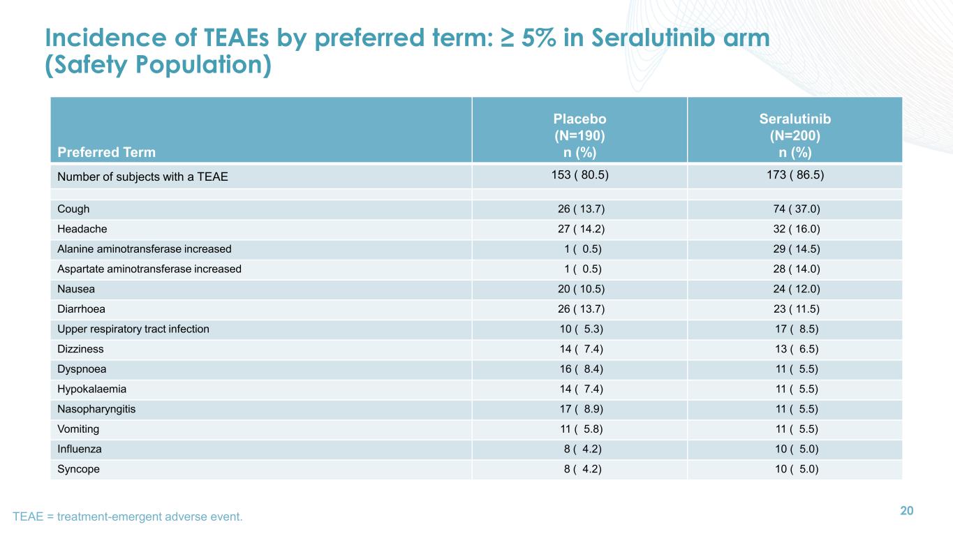 Incidence of TEAEs by preferred term: ≥ 5% in Seralutinib arm (Safety Population) TEAE = treatment-emergent adverse event. 20 Preferred Term Placebo (N=190) n (%) Seralutinib (N=200) n (%) Number of subjects with a TEAE 153 ( 80.5) 173 ( 86.5) Cough 26 ( 13.7) 74 ( 37.0) Headache 27 ( 14.2) 32 ( 16.0) Alanine aminotransferase increased 1 ( 0.5) 29 ( 14.5) Aspartate aminotransferase increased 1 ( 0.5) 28 ( 14.0) Nausea 20 ( 10.5) 24 ( 12.0) Diarrhoea 26 ( 13.7) 23 ( 11.5) Upper respiratory tract infection 10 ( 5.3) 17 ( 8.5) Dizziness 14 ( 7.4) 13 ( 6.5) Dyspnoea 16 ( 8.4) 11 ( 5.5) Hypokalaemia 14 ( 7.4) 11 ( 5.5) Nasopharyngitis 17 ( 8.9) 11 ( 5.5) Vomiting 11 ( 5.8) 11 ( 5.5) Influenza 8 ( 4.2) 10 ( 5.0) Syncope 8 ( 4.2) 10 ( 5.0)