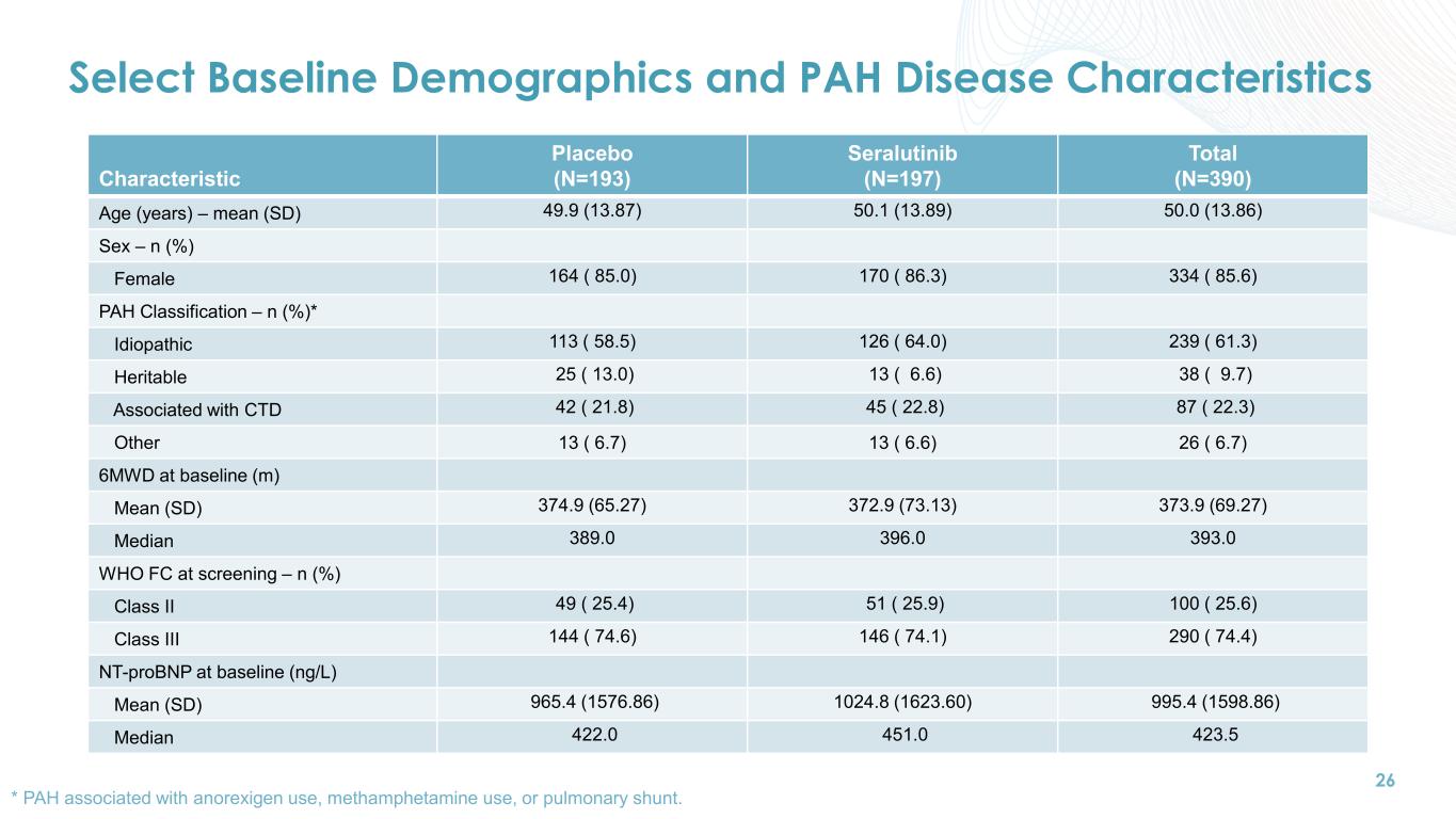 Select Baseline PAH Disease Characteristics PRA = prostacyclin receptor agonist. 27 Characteristic Placebo (N=193) Seralutinib (N=197) Total (N=390) Number of background PAH disease-specific medications – n (%) 1 9 ( 4.7) 13 ( 6.6) 22 ( 5.6) 2 76 ( 39.4) 78 ( 39.6) 154 ( 39.5) ≥ 3 108 ( 56.0) 106 ( 53.8) 214 ( 54.9) Prostacyclin/PRA – n (%) 120 (62.2) 117 (59.4) 237 (60.8) Inhaled 13 ( 6.7) 14 ( 7.1) 27 ( 6.9) Oral 50 ( 25.9) 49 ( 24.9) 99 ( 25.4) Parenteral 59 ( 30.6) 56 ( 28.4) 115 ( 29.5) Subcutaneous 37 ( 19.2) 30 ( 15.2) 67 ( 17.2) Intravenous (IV) 22 ( 11.4) 26 ( 13.2) 48 ( 12.3)