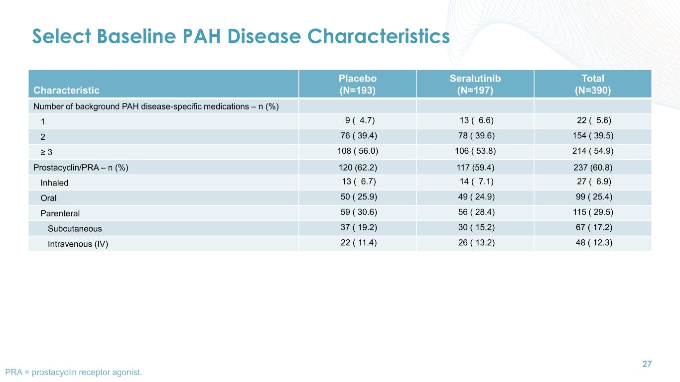 Select Baseline Demographics and PAH Disease Characteristics * PAH associated with anorexigen use, methamphetamine use, or pulmonary shunt. 26 Characteristic Placebo (N=193) Seralutinib (N=197) Total (N=390) Age (years) – mean (SD) 49.9 (13.87) 50.1 (13.89) 50.0 (13.86) Sex – n (%) Female 164 ( 85.0) 170 ( 86.3) 334 ( 85.6) PAH Classification – n (%)* Idiopathic 113 ( 58.5) 126 ( 64.0) 239 ( 61.3) Heritable 25 ( 13.0) 13 ( 6.6) 38 ( 9.7) Associated with CTD 42 ( 21.8) 45 ( 22.8) 87 ( 22.3) Other 13 ( 6.7) 13 ( 6.6) 26 ( 6.7) 6MWD at baseline (m) Mean (SD) 374.9 (65.27) 372.9 (73.13) 373.9 (69.27) Median 389.0 396.0 393.0 WHO FC at screening – n (%) Class II 49 ( 25.4) 51 ( 25.9) 100 ( 25.6) Class III 144 ( 74.6) 146 ( 74.1) 290 ( 74.4) NT-proBNP at baseline (ng/L) Mean (SD) 965.4 (1576.86) 1024.8 (1623.60) 995.4 (1598.86) Median 422.0 451.0 423.5