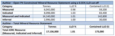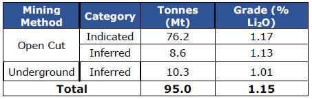 | 11. | The Mineral Resource Estimate has been reported within a conceptual pit shell at a cut-off grade of 0.60% Li2O , which is based on geological, technical and metallurgical considerations. The cut-off grade for underground resources was calculated at 0.70% Li2O; it used identical costs and recoveries, except for mining costs being at C$100/t. |