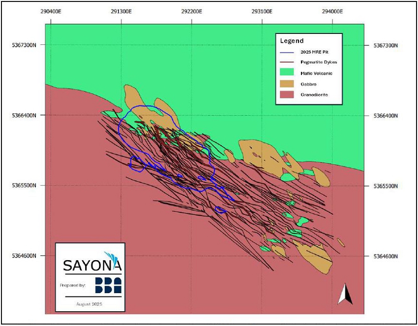 Figure 2 - Plan view illustrating the pegmatite dykes, the host rock and the 2025 Mineral Resource Estimate pit for the North American Lithium operation