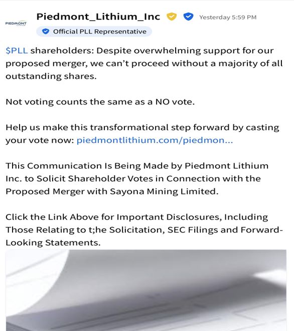 This communication relates to the proposed merger involving Piedmont Lithium Inc. (the “Company”) and Sayona Mining Limited and may be deemed to constitute solicitation material. In connection with