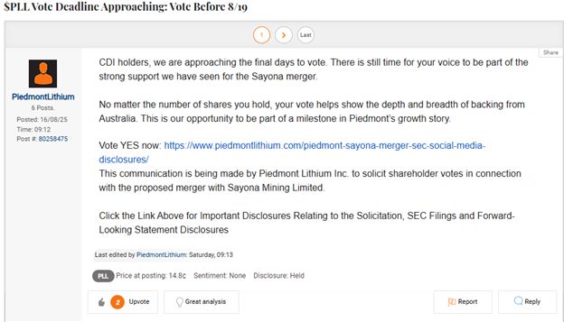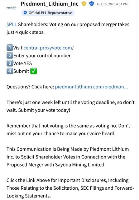 A social media post issued by Piedmont Lithium Inc. (the “Company”) on Stocktwits relating to voting FOR the Company’s proposed merger with Sayona Mining Limited (the “Merger”).