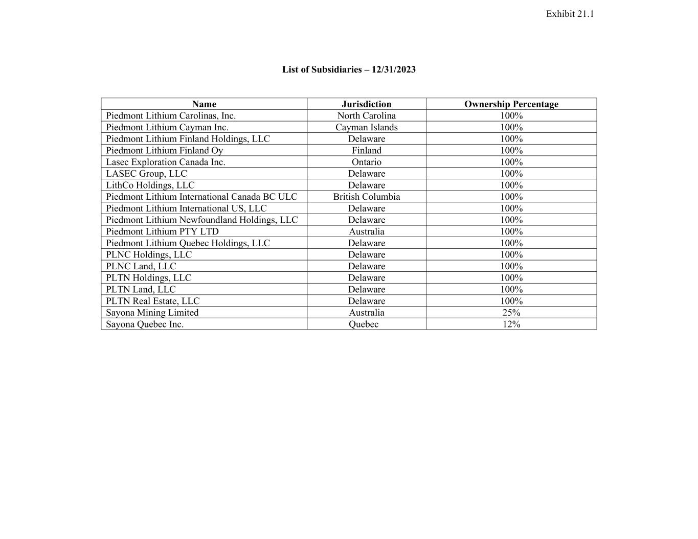 List of Subsidiaries – 12/31/2023 Name Jurisdiction Ownership Percentage Piedmont Lithium Carolinas, Inc. North Carolina 100% Piedmont Lithium Cayman Inc. Cayman Islands 100% Piedmont Lithium Finland Holdings, LLC Delaware 100% Piedmont Lithium Finland Oy Finland 100% Lasec Exploration Canada Inc. Ontario 100% LASEC Group, LLC Delaware 100% LithCo Holdings, LLC Delaware 100% Piedmont Lithium International Canada BC ULC British Columbia 100% Piedmont Lithium International US, LLC Delaware 100% Piedmont Lithium Newfoundland Holdings, LLC Delaware 100% Piedmont Lithium PTY LTD Australia 100% Piedmont Lithium Quebec Holdings, LLC Delaware 100% PLNC Holdings, LLC Delaware 100% PLNC Land, LLC Delaware 100% PLTN Holdings, LLC Delaware 100% PLTN Land, LLC Delaware 100% PLTN Real Estate, LLC Delaware 100% Sayona Mining Limited Australia 25% Sayona Quebec Inc. Quebec 12% Exhibit 21.1