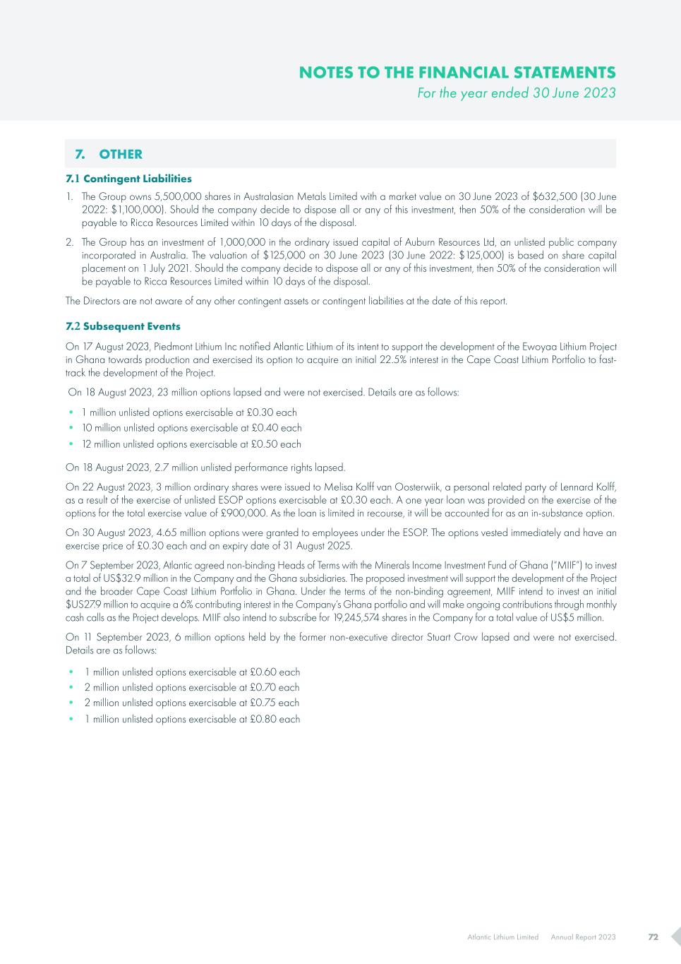 Atlantic Lithium Limited Annual Report 2023 72 7. OTHER 7.1 Contingent Liabilities 1. The Group owns 5,500,000 shares in Australasian Metals Limited with a market value on 30 June 2023 of $632,500 (30 June 2022: $1,100,000). Should the company decide to dispose all or any of this investment, then 50% of the consideration will be payable to Ricca Resources Limited within 10 days of the disposal. 2. The Group has an investment of 1,000,000 in the ordinary issued capital of Auburn Resources Ltd, an unlisted public company incorporated in Australia. The valuation of $125,000 on 30 June 2023 (30 June 2022: $125,000) is based on share capital placement on 1 July 2021. Should the company decide to dispose all or any of this investment, then 50% of the consideration will be payable to Ricca Resources Limited within 10 days of the disposal. The Directors are not aware of any other contingent assets or contingent liabilities at the date of this report. 7.2 Subsequent Events On 17 August 2023, Piedmont Lithium Inc notified Atlantic Lithium of its intent to support the development of the Ewoyaa Lithium Project in Ghana towards production and exercised its option to acquire an initial 22.5% interest in the Cape Coast Lithium Portfolio to fast- track the development of the Project. On 18 August 2023, 23 million options lapsed and were not exercised. Details are as follows: • 1 million unlisted options exercisable at £0.30 each • 10 million unlisted options exercisable at £0.40 each • 12 million unlisted options exercisable at £0.50 each On 18 August 2023, 2.7 million unlisted performance rights lapsed. On 22 August 2023, 3 million ordinary shares were issued to Melisa Kolff van Oosterwiik, a personal related party of Lennard Kolff, as a result of the exercise of unlisted ESOP options exercisable at £0.30 each. A one year loan was provided on the exercise of the options for the total exercise value of £900,000. As the loan is limited in recourse, it will be accounted for as an in-substance option. On 30 August 2023, 4.65 million options were granted to employees under the ESOP. The options vested immediately and have an exercise price of £0.30 each and an expiry date of 31 August 2025. On 7 September 2023, Atlantic agreed non-binding Heads of Terms with the Minerals Income Investment Fund of Ghana (“MIIF”) to invest a total of US$32.9 million in the Company and the Ghana subsidiaries. The proposed investment will support the development of the Project and the broader Cape Coast Lithium Portfolio in Ghana. Under the terms of the non-binding agreement, MIIF intend to invest an initial $US27.9 million to acquire a 6% contributing interest in the Company’s Ghana portfolio and will make ongoing contributions through monthly cash calls as the Project develops. MIIF also intend to subscribe for 19,245,574 shares in the Company for a total value of US$5 million. On 11 September 2023, 6 million options held by the former non-executive director Stuart Crow lapsed and were not exercised. Details are as follows: • 1 million unlisted options exercisable at £0.60 each • 2 million unlisted options exercisable at £0.70 each • 2 million unlisted options exercisable at £0.75 each • 1 million unlisted options exercisable at £0.80 each NOTES TO THE FINANCIAL STATEMENTS For the year ended 30 June 2023