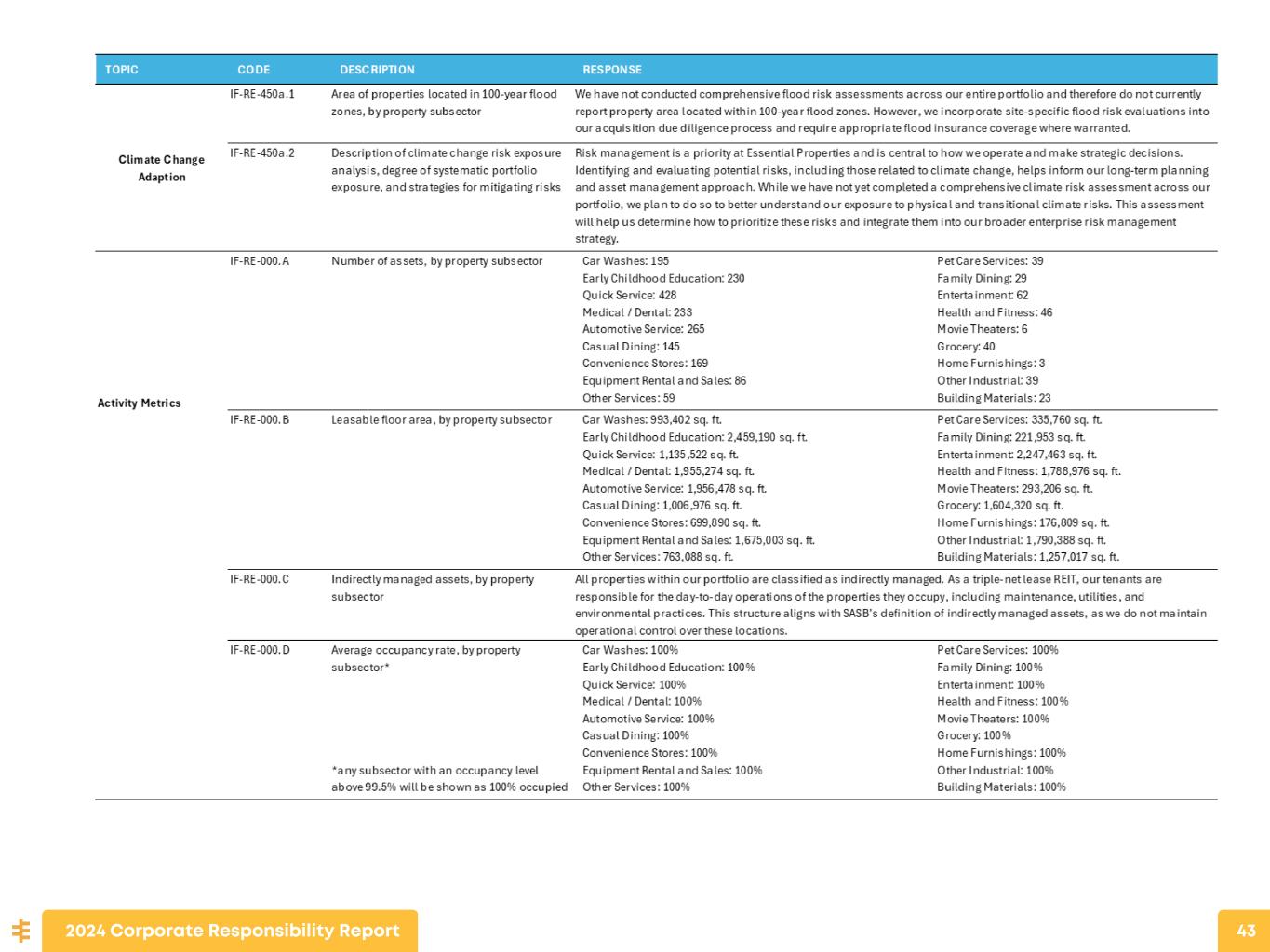 ABOUT THIS REPORT This is Essential Properties' second Corporate Responsibility Report and contains indices aligned with ESG reporting frameworks and standards, including the Sustainability Accounting Standards Board (SASB) and Task Force on Climate-related Financial Disclosures (TCFD). The information and metrics included in this report cover EPRT's operations as of December 31st, 2024 or for the 2024 calendar year, unless otherwise stated. FORWARD LOOKING STATEMENTS This presentation may contain forward-looking statements within the meaning of the Private Securities Litigation Reform Act of 1995 and other federal securities laws. These forward-looking statements can be identified by the use of words such as “expect,” “plan,” "will," “estimate,” “project,” “intend,” “believe,” “guidance,” and other similar expressions that do not relate to historical matters. These forward-looking statements are subject to known and unknown risks and uncertainties that can cause actual results to differ materially from those currently anticipated due to a number of factors, which include, but are not limited to, our continued ability to source new investments, risks associated with using debt and equity financing to fund our business activities (including refinancing and interest rate risks, changes in interest rates and/or credit spreads, changes in the price of our common shares, and conditions of the equity and debt capital markets, generally), unknown liabilities acquired in connection with acquired properties or interests in real-estate related entities, general risks affecting the real estate industry and local real estate markets (including, without limitation, the market value of our properties, the inability to enter into or renew leases at favorable rates, portfolio occupancy varying from our expectations, dependence on tenants’ financial condition and operating performance, and competition from other developers, owners and operators of real estate), the financial performance of our retail tenants and the demand for retail space, particularly with respect to challenges being experienced by general merchandise retailers, potential fluctuations in the consumer price index, risks associated with our failure to maintain our status as a REIT under the Internal Revenue Code of 1986, as amended, and other additional risks discussed in our filings with the Securities and Exchange Commission. We expressly disclaim any responsibility to update or revise forward-looking statements, whether as a result of new information, future events or otherwise, except as required by law. 2024 Corporate Responsibility Report 40
