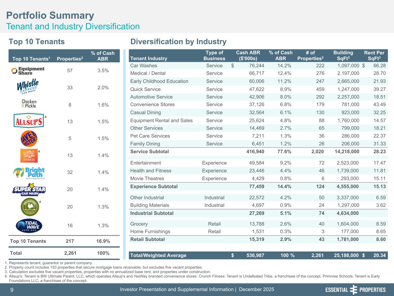 Investor Presentation and Supplemental Information | December 20259 254, 192, 59 75, 108, 127 146, 204, 238 0, 0, 0 38, 169, 224 153, 223, 227 Top 10 Tenants1 Properties2 % of Cash ABR 57 3.5% 33 2.0% 8 1.6% 13 1.5% 5 1.5% 13 1.4% 32 1.4% 20 1.4% 20 1.3% 16 1.3% Top 10 Tenants 217 16.9% Total 2,261 100% 1. Represents tenant, guarantor or parent company. 2. Property count includes 153 properties that secure mortgage loans receivable, but excludes five vacant properties. 3. Calculation excludes five vacant properties, properties with no annualized base rent, and properties under construction. 4. Allsup's: Tenant is BW Ultimate Parent, LLC, which operates Allsup's and YesWay branded convenience stores. Crunch Fitness: Tenant is Undefeated Tribe, a franchisee of the concept. Primrose Schools: Tenant is Early Foundations LLC, a franchisee of the concept. Portfolio Summary Tenant and Industry Diversification 242, 242, 242 Top 10 Tenants Diversification by Industry Tenant Industry Type of Business Cash ABR ($'000s) % of Cash ABR # of Properties2 Building SqFt3 Rent Per SqFt3 Car Washes Service $ 76,244 14.2 % 222 1,097,000 $ 66.28 Medical / Dental Service 66,717 12.4 % 276 2,197,000 28.70 Early Childhood Education Service 60,006 11.2 % 247 2,665,000 21.93 Quick Service Service 47,622 8.9 % 459 1,247,000 39.27 Automotive Service Service 42,906 8.0 % 292 2,257,000 18.51 Convenience Stores Service 37,126 6.8 % 179 781,000 43.49 Casual Dining Service 32,564 6.1 % 130 923,000 32.25 Equipment Rental and Sales Service 25,624 4.8 % 88 1,760,000 14.57 Other Services Service 14,469 2.7 % 65 799,000 18.21 Pet Care Services Service 7,211 1.3 % 36 286,000 22.37 Family Dining Service 6,451 1.2 % 26 206,000 31.33 Service Subtotal 416,940 77.6 % 2,020 14,218,000 28.23 Entertainment Experience 49,584 9.2 % 72 2,523,000 17.47 Health and Fitness Experience 23,446 4.4 % 46 1,739,000 11.81 Movie Theatres Experience 4,429 0.8 % 6 293,000 15.11 Experience Subtotal 77,459 14.4 % 124 4,555,000 15.13 Other Industrial Industrial 22,572 4.2 % 50 3,337,000 6.59 Building Materials Industrial 4,697 0.9 % 24 1,297,000 3.62 Industrial Subtotal 27,269 5.1 % 74 4,634,000 Grocery Retail 13,788 2.6 % 40 1,604,000 8.59 Home Furnishings Retail 1,531 0.3 % 3 177,000 8.65 Retail Subtotal 15,319 2.9 % 43 1,781,000 8.60 Total/Weighted Average $ 536,987 100 % 2,261 25,188,000 $ 20.34 4 4 4