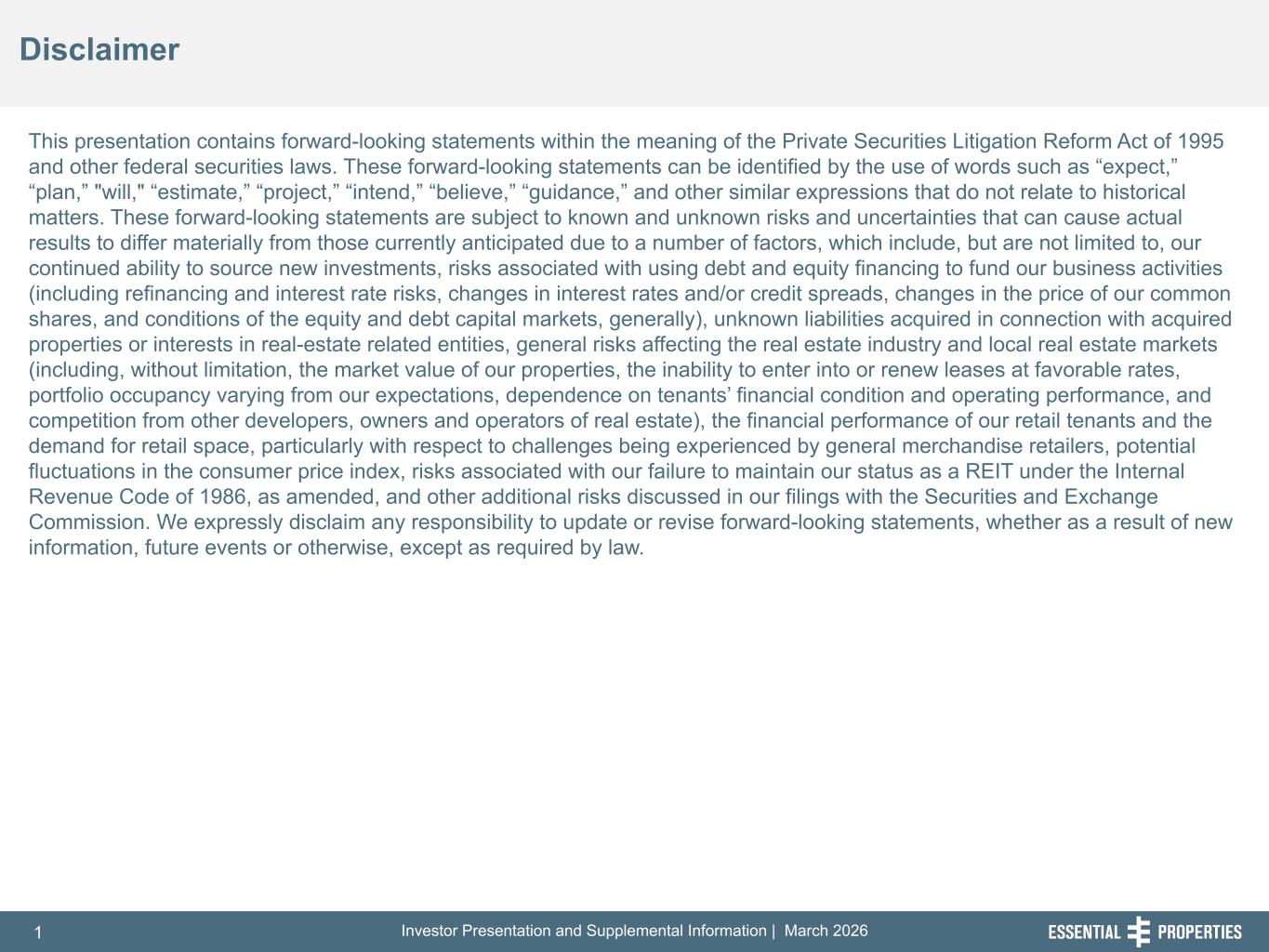 Investor Presentation and Supplemental Information | March 20261 254, 192, 59 75, 108, 127 146, 204, 238 0, 0, 0 38, 169, 224 153, 223, 227 Disclaimer 242, 242, 242 This presentation contains forward-looking statements within the meaning of the Private Securities Litigation Reform Act of 1995 and other federal securities laws. These forward-looking statements can be identified by the use of words such as “expect,” “plan,” "will," “estimate,” “project,” “intend,” “believe,” “guidance,” and other similar expressions that do not relate to historical matters. These forward-looking statements are subject to known and unknown risks and uncertainties that can cause actual results to differ materially from those currently anticipated due to a number of factors, which include, but are not limited to, our continued ability to source new investments, risks associated with using debt and equity financing to fund our business activities (including refinancing and interest rate risks, changes in interest rates and/or credit spreads, changes in the price of our common shares, and conditions of the equity and debt capital markets, generally), unknown liabilities acquired in connection with acquired properties or interests in real-estate related entities, general risks affecting the real estate industry and local real estate markets (including, without limitation, the market value of our properties, the inability to enter into or renew leases at favorable rates, portfolio occupancy varying from our expectations, dependence on tenants’ financial condition and operating performance, and competition from other developers, owners and operators of real estate), the financial performance of our retail tenants and the demand for retail space, particularly with respect to challenges being experienced by general merchandise retailers, potential fluctuations in the consumer price index, risks associated with our failure to maintain our status as a REIT under the Internal Revenue Code of 1986, as amended, and other additional risks discussed in our filings with the Securities and Exchange Commission. We expressly disclaim any responsibility to update or revise forward-looking statements, whether as a result of new information, future events or otherwise, except as required by law.