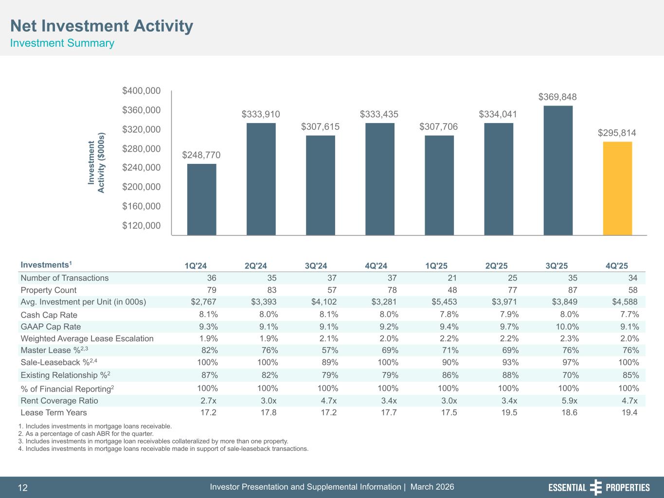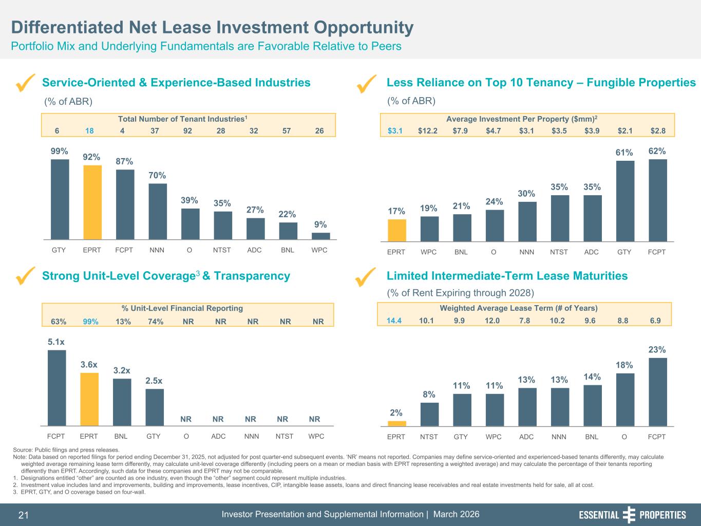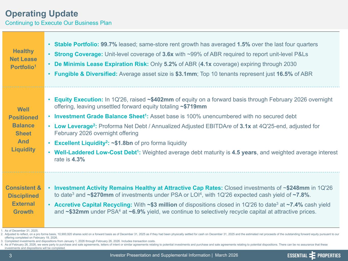 Investor Presentation and Supplemental Information | March 20263 254, 192, 59 75, 108, 127 146, 204, 238 0, 0, 0 38, 169, 224 153, 223, 227 Healthy Net Lease Portfolio1 • Stable Portfolio: 99.7% leased; same-store rent growth has averaged 1.5% over the last four quarters • Strong Coverage: Unit-level coverage of 3.6x with ~99% of ABR required to report unit-level P&Ls • De Minimis Lease Expiration Risk: Only 5.2% of ABR (4.1x coverage) expiring through 2030 • Fungible & Diversified: Average asset size is $3.1mm; Top 10 tenants represent just 16.5% of ABR Well Positioned Balance Sheet And Liquidity • Equity Execution: In 1Q'26, raised ~$402mm of equity on a forward basis through February 2026 overnight offering, leaving unsettled forward equity totaling ~$719mm • Investment Grade Balance Sheet1: Asset base is 100% unencumbered with no secured debt • Low Leverage2: Proforma Net Debt / Annualized Adjusted EBITDAre of 3.1x at 4Q'25-end, adjusted for February 2026 overnight offering • Excellent Liquidity2: ~$1.8bn of pro forma liquidity • Well-Laddered Low-Cost Debt1: Weighted average debt maturity is 4.5 years, and weighted average interest rate is 4.3% Consistent & Disciplined External Growth • Investment Activity Remains Healthy at Attractive Cap Rates: Closed investments of ~$248mm in 1Q'26 to date3 and ~$270mm of investments under PSA or LOI4, with 1Q'26 expected cash yield of ~7.8%. • Accretive Capital Recycling: With ~$3 million of dispositions closed in 1Q'26 to date3 at ~7.4% cash yield and ~$32mm under PSA4 at ~6.9% yield, we continue to selectively recycle capital at attractive prices. 1. As of December 31, 2025. 2. Adjusted to reflect, on a pro forma basis, 10,900,920 shares sold on a forward basis as of December 31, 2025 as if they had been physically settled for cash on December 31, 2025 and the estimated net proceeds of the outstanding forward equity pursuant to our offering completed on February 19, 2026. 3. Completed investments and dispositions from January 1, 2026 through February 26, 2026. Includes transaction costs. 4. As of February 26, 2026, we were party to purchase and sale agreements, letters of intent or similar agreements relating to potential investments and purchase and sale agreements relating to potential dispositions. There can be no assurance that these investments and dispositions will be completed. Operating Update Continuing to Execute Our Business Plan