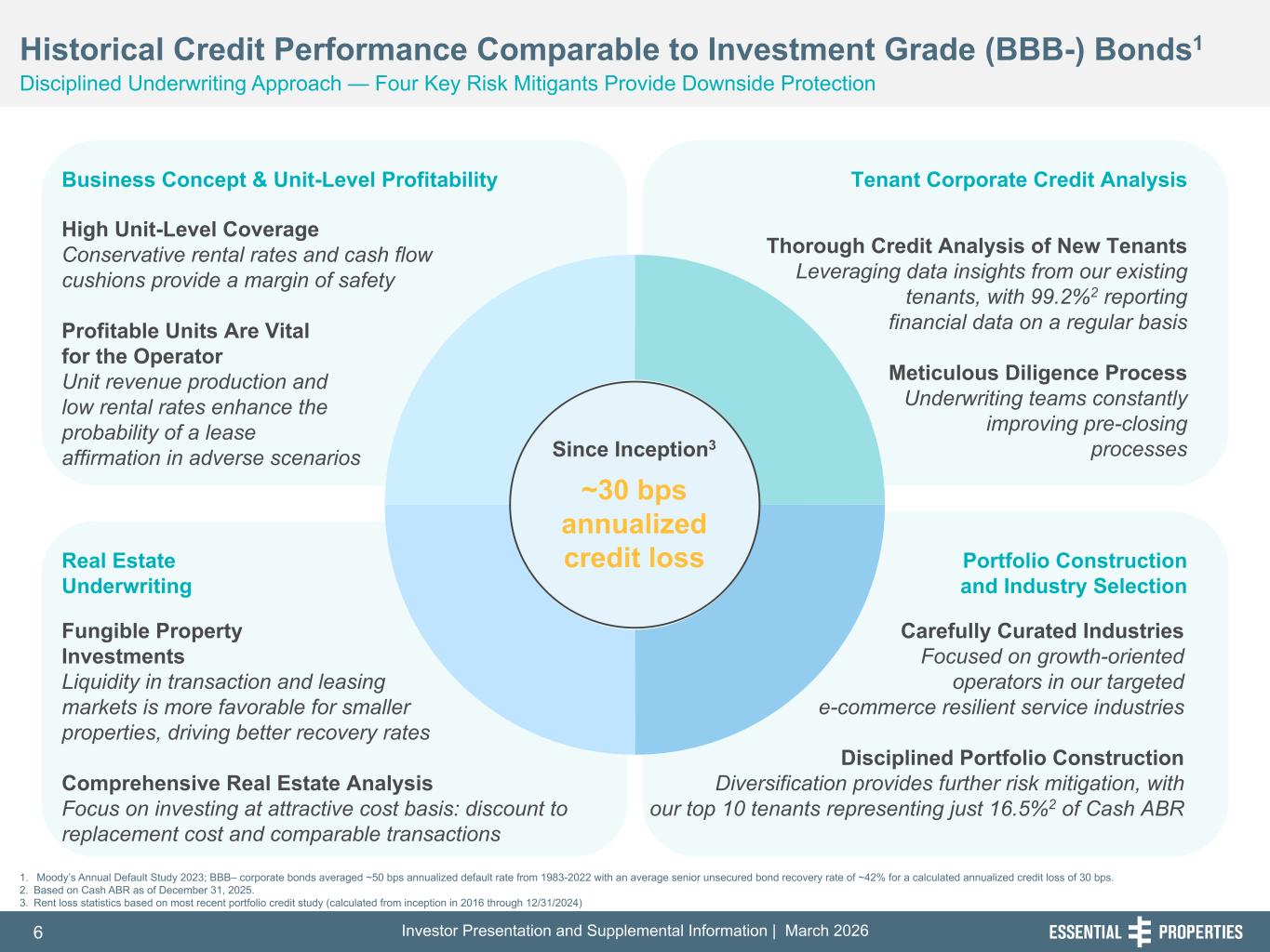 Investor Presentation and Supplemental Information | March 20265 254, 192, 59 75, 108, 127 146, 204, 238 0, 0, 0 38, 169, 224 153, 223, 227 BBB/BBB- Investment Grade Rated • Originating bespoke capital solutions, 100% structured as Sale-Leasebacks in 4Q'25 • Focused on core industries in the net lease sector, intentionally selected for e-commerce resilience • Granular focus on fungible properties in essential consumer industries with ~92%2 in the service and experiential sectors Investment Highlights Differentiated Model Built for Higher Growth with Lower Risk, Addressing a Large and Underserved Marketplace 242, 242, 242 14.4Years Weighted Average Lease Term (WALT)2 3.6x Average Unit-Level Rent Coverage2 $3.1mm Average Investment per Property2 3.1x Net Debt to Annualized Adjusted EBITDAre3 $7.5B Undepreciated Gross Assets2 Higher Growth with Methodical Deployment • Consistent sector leading annual AFFO growth of ~9%1 per share since 2019 • Methodically expanding the pipeline with compelling risk-adjusted returns through relationship- driven sourcing, highlighted by 85% repeat business in 4Q'25 • Size enables platform efficiency while facilitating growth off a smaller base of ~$7.5 bn of assets2 Lower Reliance on Capital Markets • Low leverage with PF Net Debt / EBITDAre of 3.1x3 • Conservative payout ratio of 63%2 results in nearly $160mm retained free cash flow2 per year • No debt maturities until 2027 with a weighted average maturity of 4.2 years2 Focused, Differentiated Investment Strategy Large, Growing Addressable Market • More than 200,000 businesses in the middle market, generating 1/3 of US GDP • Growth in sponsor activity among the middle market with tenants focusing on increasing store count • Structural changes in banking system driving tighter lending conditions, creating secular demand for private credit solutions Operational and Financial Highlights 1. AFFO growth calculated from 2019 to 2025. 2. As of December 31, 2025. 3. Adjusted to reflect, on a pro forma basis, 10,900,920 shares sold on a forward basis as of December 31, 2025 as if they had been physically settled for cash on December 31, 2025 and the estimated net proceeds of the outstanding forward equity pursuant to our offering completed on February 19, 2026.