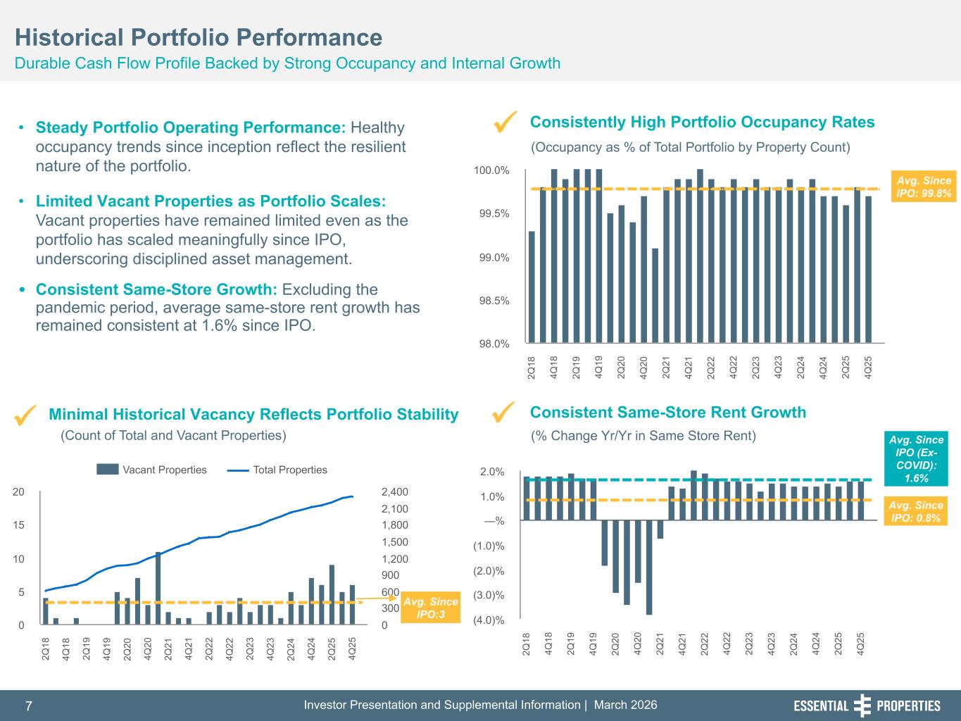 Investor Presentation and Supplemental Information | March 20266 254, 192, 59 75, 108, 127 146, 204, 238 0, 0, 0 38, 169, 224 153, 223, 227 Historical Credit Performance Comparable to Investment Grade (BBB-) Bonds1 Disciplined Underwriting Approach — Four Key Risk Mitigants Provide Downside Protection Business Concept & Unit-Level Profitability Real Estate Underwriting Portfolio Construction and Industry Selection Tenant Corporate Credit Analysis High Unit-Level Coverage Conservative rental rates and cash flow cushions provide a margin of safety Profitable Units Are Vital for the Operator Unit revenue production and low rental rates enhance the probability of a lease affirmation in adverse scenarios Fungible Property Investments Liquidity in transaction and leasing markets is more favorable for smaller properties, driving better recovery rates Comprehensive Real Estate Analysis Focus on investing at attractive cost basis: discount to replacement cost and comparable transactions Thorough Credit Analysis of New Tenants Leveraging data insights from our existing tenants, with 99.2%2 reporting financial data on a regular basis Meticulous Diligence Process Underwriting teams constantly improving pre-closing processes Carefully Curated Industries Focused on growth-oriented operators in our targeted e-commerce resilient service industries Disciplined Portfolio Construction Diversification provides further risk mitigation, with our top 10 tenants representing just 16.5%2 of Cash ABR Since Inception3 ~30 bps annualized credit loss 1. Moody’s Annual Default Study 2023; BBB– corporate bonds averaged ~50 bps annualized default rate from 1983-2022 with an average senior unsecured bond recovery rate of ~42% for a calculated annualized credit loss of 30 bps. 2. Based on Cash ABR as of December 31, 2025. 3. Rent loss statistics based on most recent portfolio credit study (calculated from inception in 2016 through 12/31/2024)