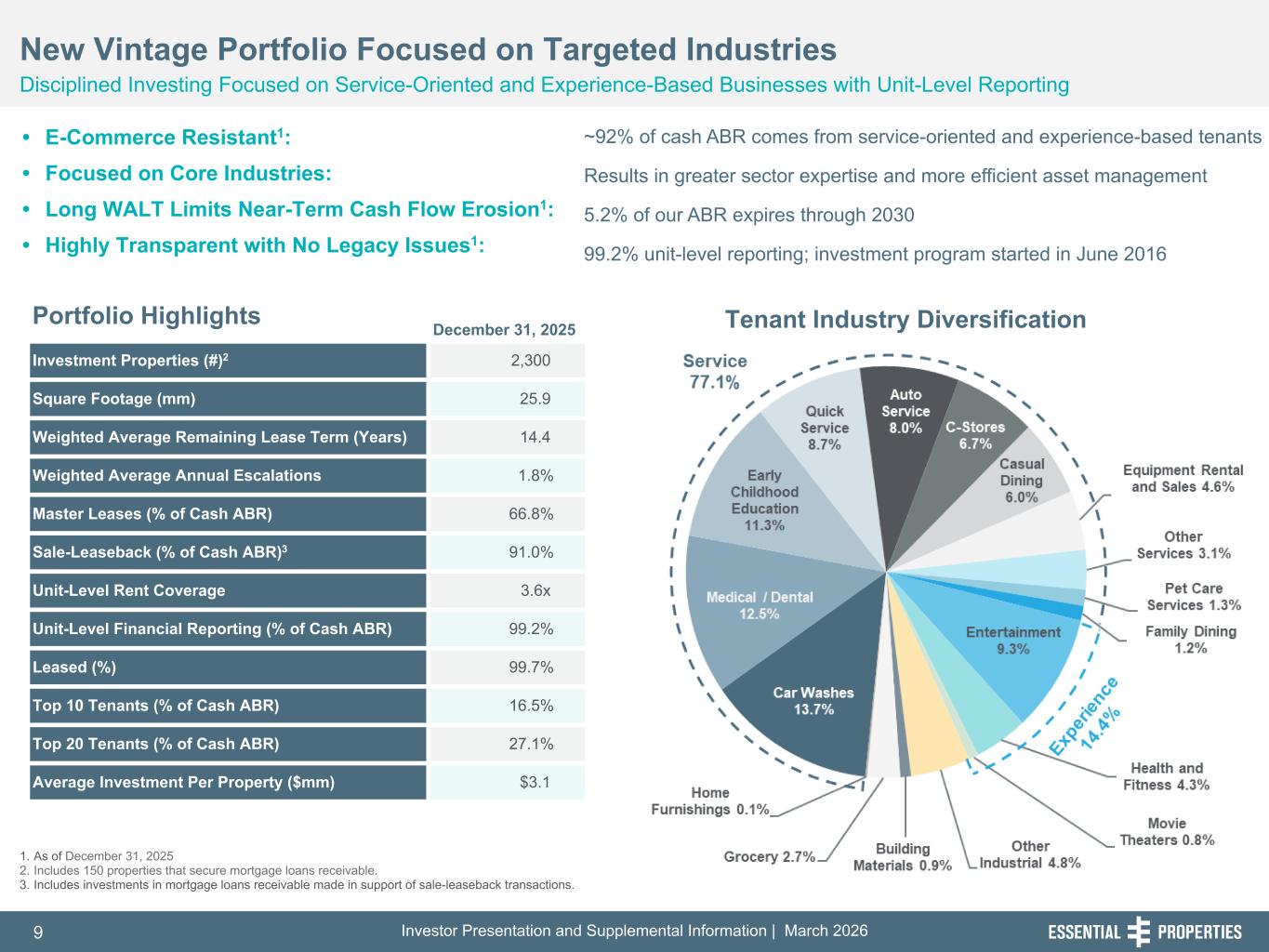 Investor Presentation and Supplemental Information | March 20269 254, 192, 59 75, 108, 127 146, 204, 238 0, 0, 0 38, 169, 224 153, 223, 227 242, 242, 242 1. As of December 31, 2025 2. Includes 150 properties that secure mortgage loans receivable. 3. Includes investments in mortgage loans receivable made in support of sale-leaseback transactions. December 31, 2025 Investment Properties (#)2 2,300 Square Footage (mm) 25.9 Weighted Average Remaining Lease Term (Years) 14.4 Weighted Average Annual Escalations 1.8 % Master Leases (% of Cash ABR) 66.8 % Sale-Leaseback (% of Cash ABR)3 91.0 % Unit-Level Rent Coverage 3.6x Unit-Level Financial Reporting (% of Cash ABR) 99.2 % Leased (%) 99.7 % Top 10 Tenants (% of Cash ABR) 16.5 % Top 20 Tenants (% of Cash ABR) 27.1 % Average Investment Per Property ($mm) $3.1 New Vintage Portfolio Focused on Targeted Industries Disciplined Investing Focused on Service-Oriented and Experience-Based Businesses with Unit-Level Reporting Portfolio Highlights • E-Commerce Resistant1: • Focused on Core Industries: • Long WALT Limits Near-Term Cash Flow Erosion1: • Highly Transparent with No Legacy Issues1: ~92% of cash ABR comes from service-oriented and experience-based tenants Results in greater sector expertise and more efficient asset management 5.2% of our ABR expires through 2030 99.2% unit-level reporting; investment program started in June 2016 Tenant Industry Diversification