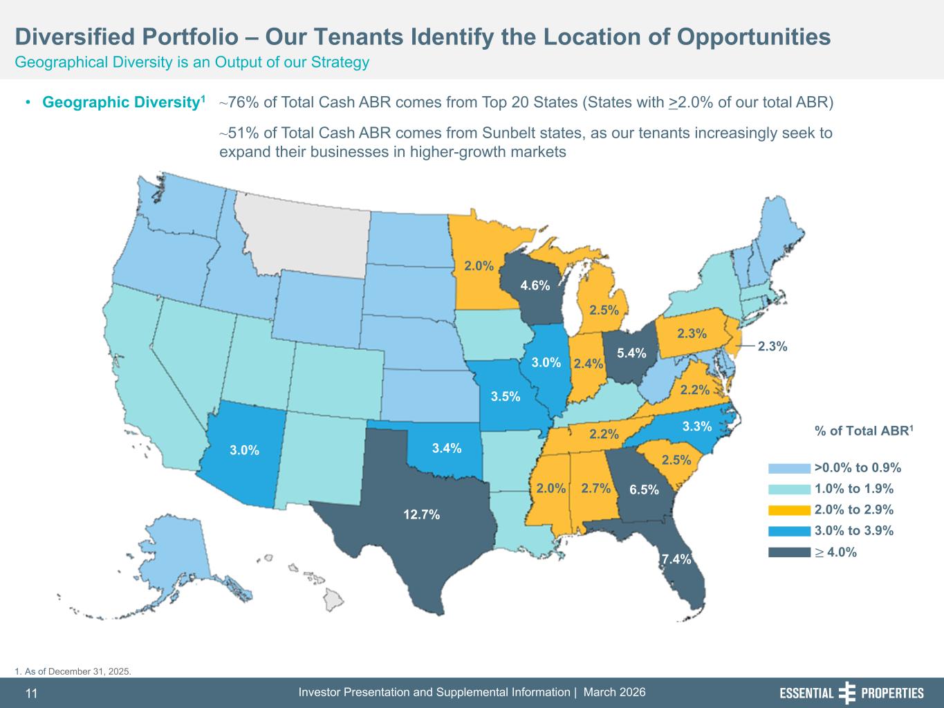 Investor Presentation and Supplemental Information | March 202611 254, 192, 59 75, 108, 127 146, 204, 238 0, 0, 0 38, 169, 224 153, 223, 227 Diversified Portfolio – Our Tenants Identify the Location of Opportunities Geographical Diversity is an Output of our Strategy • Geographic Diversity1 ~76% of Total Cash ABR comes from Top 20 States (States with >2.0% of our total ABR) ~51% of Total Cash ABR comes from Sunbelt states, as our tenants increasingly seek to expand their businesses in higher-growth markets % of Total ABR1 >0.0% to 0.9% 1.0% to 1.9% 2.0% to 2.9% 3.0% to 3.9% ≥ 4.0% 2.3% 12.7% 3.0% 3.5% 2.0% 4.6% 2.5% 3.0% 3.4% 2.0% 5.4% 3.3% 6.5%2.7% 7.4% 2.2% 2.4% 2.5% 1. As of December 31, 2025. 2.3% 2.2%
