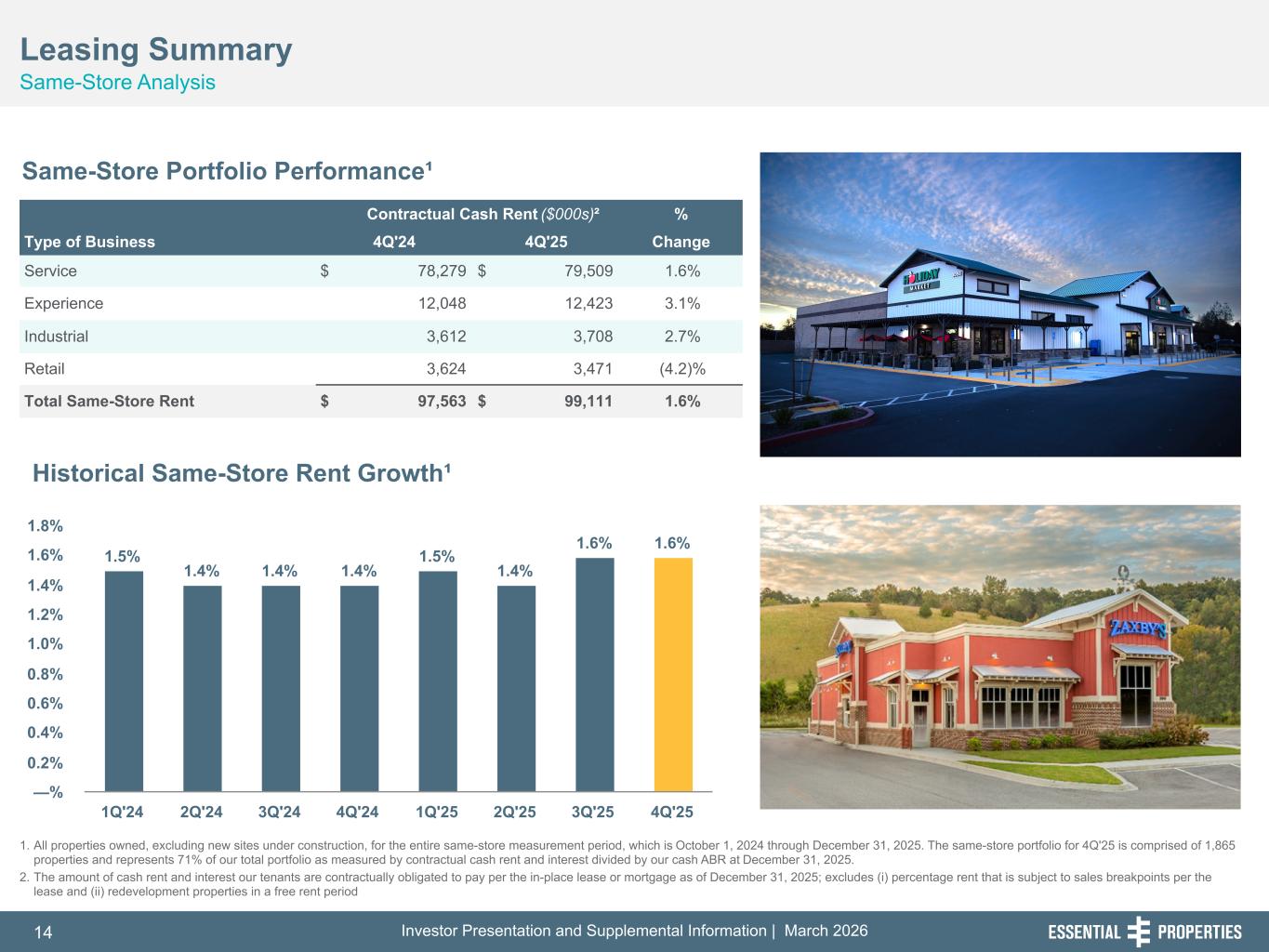 Investor Presentation and Supplemental Information | March 202614 254, 192, 59 75, 108, 127 146, 204, 238 0, 0, 0 38, 169, 224 153, 223, 227 Leasing Summary Same-Store Analysis 242, 242, 242 Same-Store Portfolio Performance¹ Contractual Cash Rent ($000s)² % Type of Business 4Q'24 4Q'25 Change Service $ 78,279 $ 79,509 1.6% Experience 12,048 12,423 3.1% Industrial 3,612 3,708 2.7% Retail 3,624 3,471 (4.2)% Total Same-Store Rent $ 97,563 $ 99,111 1.6% 1.5% 1.4% 1.4% 1.4% 1.5% 1.4% 1.6% 1.6% 1Q'24 2Q'24 3Q'24 4Q'24 1Q'25 2Q'25 3Q'25 4Q'25 —% 0.2% 0.4% 0.6% 0.8% 1.0% 1.2% 1.4% 1.6% 1.8% 1. All properties owned, excluding new sites under construction, for the entire same-store measurement period, which is October 1, 2024 through December 31, 2025. The same-store portfolio for 4Q'25 is comprised of 1,865 properties and represents 71% of our total portfolio as measured by contractual cash rent and interest divided by our cash ABR at December 31, 2025. 2. The amount of cash rent and interest our tenants are contractually obligated to pay per the in-place lease or mortgage as of December 31, 2025; excludes (i) percentage rent that is subject to sales breakpoints per the lease and (ii) redevelopment properties in a free rent period Historical Same-Store Rent Growth¹