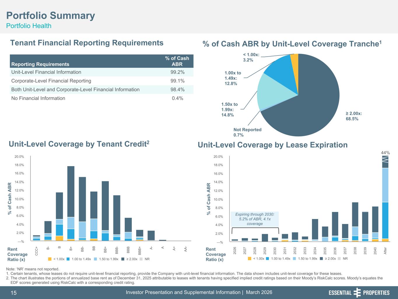 Investor Presentation and Supplemental Information | March 202615 254, 192, 59 75, 108, 127 146, 204, 238 0, 0, 0 38, 169, 224 153, 223, 227 ≥ 2.00x: 68.5% Not Reported 0.7% 1.50x to 1.99x: 14.8% 1.00x to 1.49x: 12.8% < 1.00x: 3.2% % o f C as h A B R < 1.00x 1.00 to 1.49x 1.50 to 1.99x ≥ 2.00x NR C C C + B - B B + B B - B B B B + B B B - B B B B B B + A - A A + A A - —% 2.0% 4.0% 6.0% 8.0% 10.0% 12.0% 14.0% 16.0% 18.0% 20.0% % o f C as h A B R < 1.00x 1.00 to 1.49x 1.50 to 1.99x ≥ 2.00x NR 20 26 20 27 20 28 20 29 20 30 20 31 20 32 20 33 20 34 20 35 20 36 20 37 20 38 20 39 20 40 A fte r —% 2.0% 4.0% 6.0% 8.0% 10.0% 12.0% 14.0% 16.0% 18.0% 20.0% 44% Portfolio Summary Portfolio Health Tenant Financial Reporting Requirements % of Cash ABR by Unit-Level Coverage Tranche1 Unit-Level Coverage by Lease ExpirationUnit-Level Coverage by Tenant Credit2 Note: ‘NR’ means not reported. 1. Certain tenants, whose leases do not require unit-level financial reporting, provide the Company with unit-level financial information. The data shown includes unit-level coverage for these leases. 2. The chart illustrates the portions of annualized base rent as of December 31, 2025 attributable to leases with tenants having specified implied credit ratings based on their Moody’s RiskCalc scores. Moody’s equates the EDF scores generated using RiskCalc with a corresponding credit rating. Rent Coverage Ratio (x) Reporting Requirements % of Cash ABR Unit-Level Financial Information 99.2% Corporate-Level Financial Reporting 99.1% Both Unit-Level and Corporate-Level Financial Information 98.4% No Financial Information 0.4% Rent Coverage Ratio (x) Expiring through 2030: 5.2% of ABR, 4.1x coverage