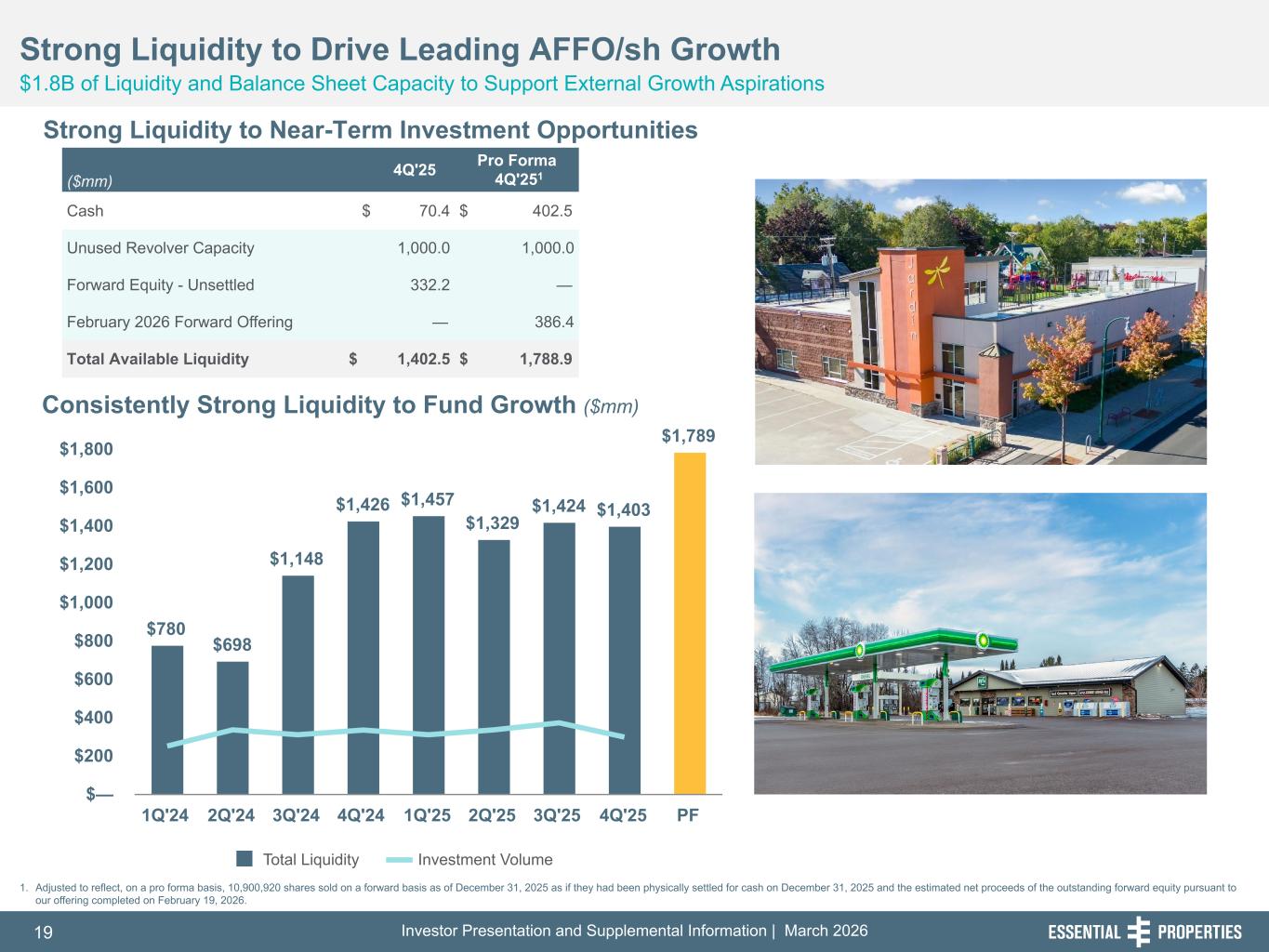 Investor Presentation and Supplemental Information | March 202619 254, 192, 59 75, 108, 127 146, 204, 238 0, 0, 0 38, 169, 224 153, 223, 227 Consistently Strong Liquidity to Fund Growth ($mm) Strong Liquidity to Drive Leading AFFO/sh Growth $1.8B of Liquidity and Balance Sheet Capacity to Support External Growth Aspirations 242, 242, 242 ($mm) 4Q'25 Pro Forma 4Q'251 Cash $ 70.4 $ 402.5 Unused Revolver Capacity 1,000.0 1,000.0 Forward Equity - Unsettled 332.2 — February 2026 Forward Offering — 386.4 Total Available Liquidity $ 1,402.5 $ 1,788.9 1. Adjusted to reflect, on a pro forma basis, 10,900,920 shares sold on a forward basis as of December 31, 2025 as if they had been physically settled for cash on December 31, 2025 and the estimated net proceeds of the outstanding forward equity pursuant to our offering completed on February 19, 2026. Strong Liquidity to Near-Term Investment Opportunities $780 $698 $1,148 $1,426 $1,457 $1,329 $1,424 $1,403 $1,789 Total Liquidity Investment Volume 1Q'24 2Q'24 3Q'24 4Q'24 1Q'25 2Q'25 3Q'25 4Q'25 PF $— $200 $400 $600 $800 $1,000 $1,200 $1,400 $1,600 $1,800