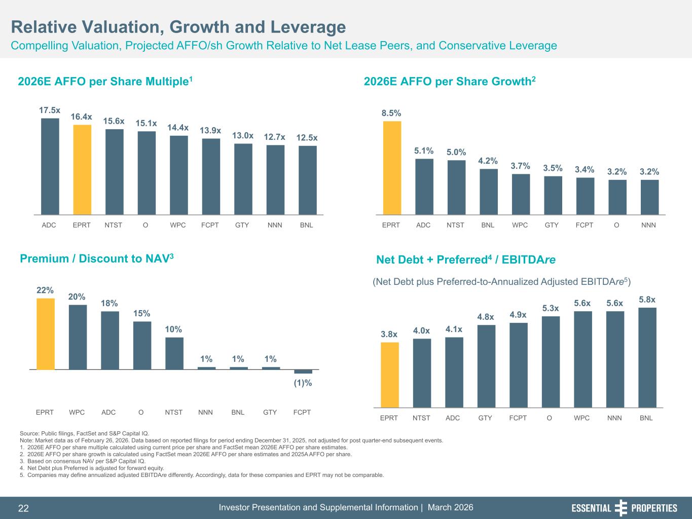 Investor Presentation and Supplemental Information | March 202621 254, 192, 59 75, 108, 127 146, 204, 238 0, 0, 0 38, 169, 224 153, 223, 227 Source: Public filings and press releases. Note: Data based on reported filings for period ending December 31, 2025, not adjusted for post quarter-end subsequent events. ‘NR’ means not reported. Companies may define service-oriented and experienced-based tenants differently, may calculate weighted average remaining lease term differently, may calculate unit-level coverage differently (including peers on a mean or median basis with EPRT representing a weighted average) and may calculate the percentage of their tenants reporting differently than EPRT. Accordingly, such data for these companies and EPRT may not be comparable. 1. Designations entitled “other” are counted as one industry, even though the “other” segment could represent multiple industries. 2. Investment value includes land and improvements, building and improvements, lease incentives, CIP, intangible lease assets, loans and direct financing lease receivables and real estate investments held for sale, all at cost. 3. EPRT, GTY, and O coverage based on four-wall. Differentiated Net Lease Investment Opportunity Portfolio Mix and Underlying Fundamentals are Favorable Relative to Peers Strong Unit-Level Coverage3 & Transparency Service-Oriented & Experience-Based Industries Limited Intermediate-Term Lease Maturities 242, 242, 242 (% of ABR) (% of Rent Expiring through 2028) Less Reliance on Top 10 Tenancy – Fungible Properties (% of ABR) 17% 19% 21% 24% 30% 35% 35% 61% 62% EPRT WPC BNL O NNN NTST ADC GTY FCPT 99% 92% 87% 70% 39% 35% 27% 22% 9% GTY EPRT FCPT NNN O NTST ADC BNL WPC 5.1x 3.6x 3.2x 2.5x FCPT EPRT BNL GTY O ADC NNN NTST WPC Total Number of Tenant Industries1 % Unit-Level Financial Reporting Average Investment Per Property ($mm)2 Weighted Average Lease Term (# of Years) NR NR NR NR 2% 8% 11% 11% 13% 13% 14% 18% 23% EPRT NTST GTY WPC ADC NNN BNL O FCPT 6 18 4 37 92 28 32 57 26 $3.1 $12.2 $7.9 $4.7 $3.1 $3.5 $3.9 $2.1 $2.8 63% 99% 13% 74% NR NR NR NR NR 14.4 10.1 9.9 12.0 7.8 10.2 9.6 8.8 6.9 NR
