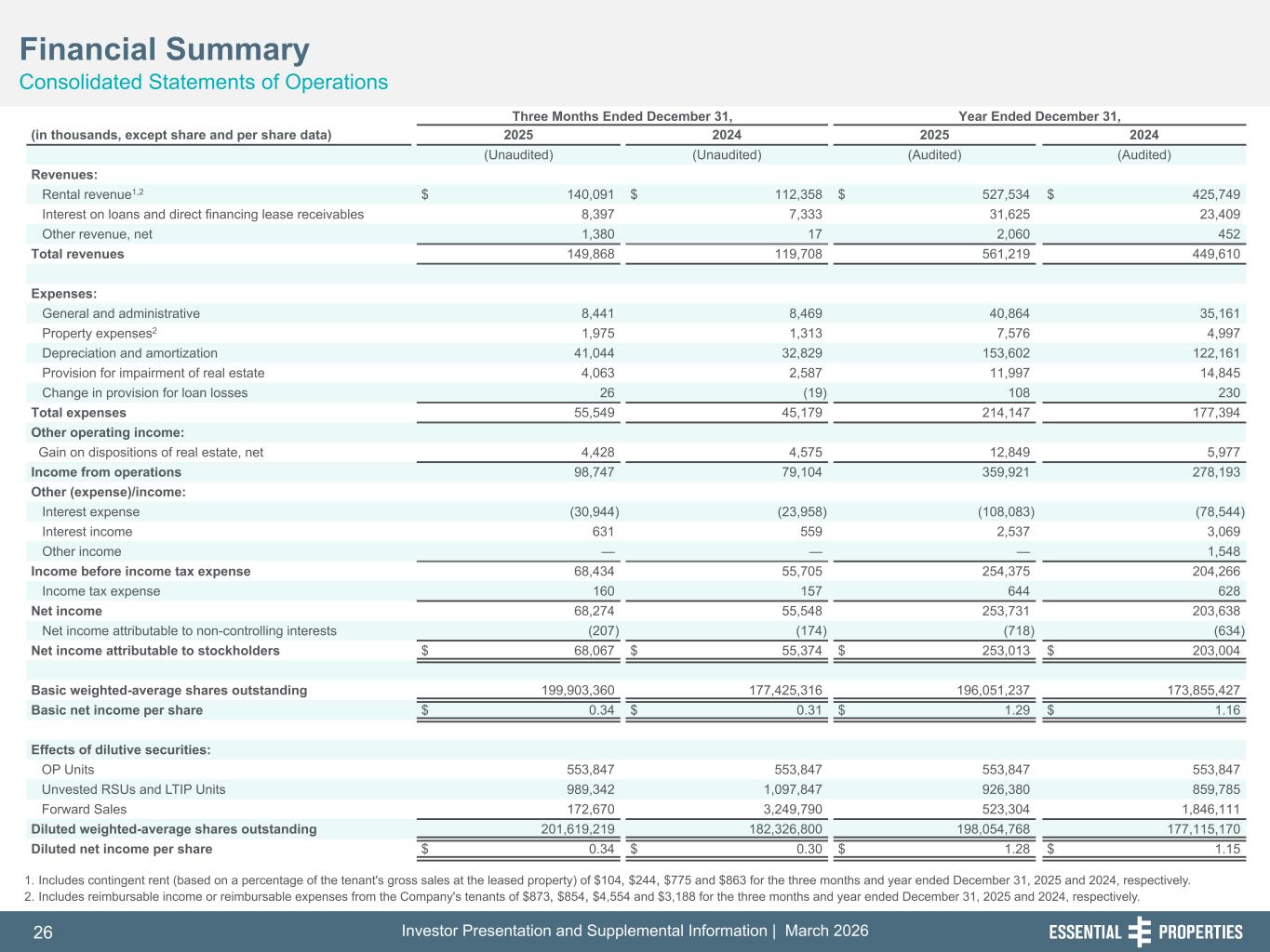 Investor Presentation and Supplemental Information | March 202626 254, 192, 59 75, 108, 127 146, 204, 238 0, 0, 0 38, 169, 224 153, 223, 227 1. Includes contingent rent (based on a percentage of the tenant's gross sales at the leased property) of $104, $244, $775 and $863 for the three months and year ended December 31, 2025 and 2024, respectively. 2. Includes reimbursable income or reimbursable expenses from the Company's tenants of $873, $854, $4,554 and $3,188 for the three months and year ended December 31, 2025 and 2024, respectively. Three Months Ended December 31, Year Ended December 31, (in thousands, except share and per share data) 2025 2024 2025 2024 (Unaudited) (Unaudited) (Audited) (Audited) Revenues: Rental revenue1,2 $ 140,091 $ 112,358 $ 527,534 $ 425,749 Interest on loans and direct financing lease receivables 8,397 7,333 31,625 23,409 Other revenue, net 1,380 17 2,060 452 Total revenues 149,868 119,708 561,219 449,610 Expenses: General and administrative 8,441 8,469 40,864 35,161 Property expenses2 1,975 1,313 7,576 4,997 Depreciation and amortization 41,044 32,829 153,602 122,161 Provision for impairment of real estate 4,063 2,587 11,997 14,845 Change in provision for loan losses 26 (19) 108 230 Total expenses 55,549 45,179 214,147 177,394 Other operating income: Gain on dispositions of real estate, net 4,428 4,575 12,849 5,977 Income from operations 98,747 79,104 359,921 278,193 Other (expense)/income: Interest expense (30,944) (23,958) (108,083) (78,544) Interest income 631 559 2,537 3,069 Other income — — — 1,548 Income before income tax expense 68,434 55,705 254,375 204,266 Income tax expense 160 157 644 628 Net income 68,274 55,548 253,731 203,638 Net income attributable to non-controlling interests (207) (174) (718) (634) Net income attributable to stockholders $ 68,067 $ 55,374 $ 253,013 $ 203,004 Basic weighted-average shares outstanding 199,903,360 177,425,316 196,051,237 173,855,427 Basic net income per share $ 0.34 $ 0.31 $ 1.29 $ 1.16 Effects of dilutive securities: OP Units 553,847 553,847 553,847 553,847 Unvested RSUs and LTIP Units 989,342 1,097,847 926,380 859,785 Forward Sales 172,670 3,249,790 523,304 1,846,111 Diluted weighted-average shares outstanding 201,619,219 182,326,800 198,054,768 177,115,170 Diluted net income per share $ 0.34 $ 0.30 $ 1.28 $ 1.15 Financial Summary Consolidated Statements of Operations 242, 242, 242