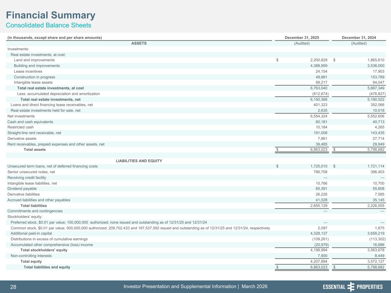 Investor Presentation and Supplemental Information | March 202628 254, 192, 59 75, 108, 127 146, 204, 238 0, 0, 0 38, 169, 224 153, 223, 227 Financial Summary Consolidated Balance Sheets 242, 242, 242 (in thousands, except share and per share amounts) December 31, 2025 December 31, 2024 ASSETS (Audited) (Audited) Investments: Real estate investments, at cost: Land and improvements $ 2,200,829 $ 1,865,610 Building and improvements 4,388,959 3,536,000 Lease incentives 24,154 17,903 Construction in progress 49,881 153,789 Intangible lease assets 99,217 94,047 Total real estate investments, at cost 6,763,040 5,667,349 Less: accumulated depreciation and amortization (612,674) (476,827) Total real estate investments, net 6,150,366 5,190,522 Loans and direct financing lease receivables, net 401,323 352,066 Real estate investments held for sale, net 2,635 10,018 Net investments 6,554,324 5,552,606 Cash and cash equivalents 60,181 40,713 Restricted cash 10,184 4,265 Straight-line rent receivable, net 191,008 143,435 Derivative assets 7,861 27,714 Rent receivables, prepaid expenses and other assets, net 39,465 29,949 Total assets $ 6,863,023 $ 5,798,682 LIABILITIES AND EQUITY Unsecured term loans, net of deferred financing costs $ 1,725,010 $ 1,721,114 Senior unsecured notes, net 786,708 396,403 Revolving credit facility — — Intangible lease liabilities, net 10,766 10,700 Dividend payable 65,391 55,608 Derivative liabilities 26,226 7,585 Accrued liabilities and other payables 41,028 35,145 Total liabilities 2,655,129 2,226,555 Commitments and contingencies — — Stockholders' equity: Preferred stock, $0.01 par value; 150,000,000 authorized; none issued and outstanding as of 12/31/25 and 12/31/24 — — Common stock, $0.01 par value; 500,000,000 authorized; 209,702,433 and 187,537,592 issued and outstanding as of 12/31/25 and 12/31/24, respectively 2,097 1,875 Additional paid-in capital 4,328,137 3,658,219 Distributions in excess of cumulative earnings (109,261) (113,302) Accumulated other comprehensive (loss) income (20,979) 16,886 Total stockholders' equity 4,199,994 3,563,678 Non-controlling interests 7,900 8,449 Total equity 4,207,894 3,572,127 Total liabilities and equity $ 6,863,023 $ 5,798,682
